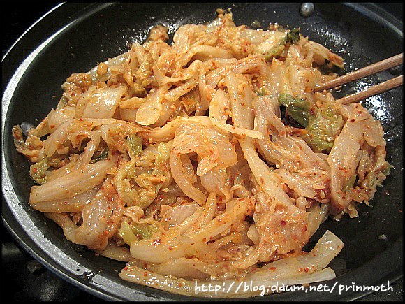 팬에 들기름 한스픈을 두른 다음 재워 두었던 묵은지를 달달 볶아 주셔요~~