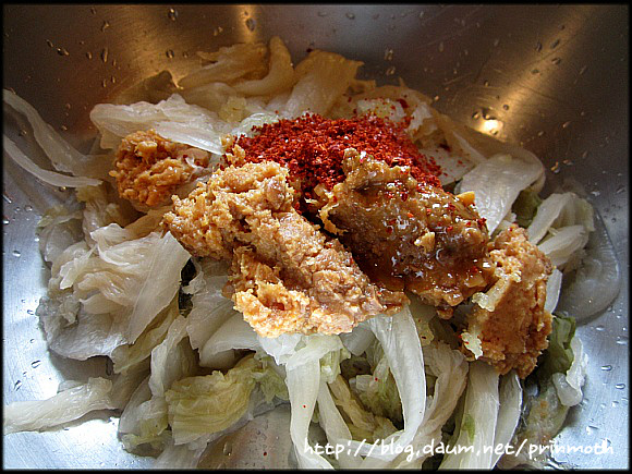 전 백김치 1/4쪽에 다진 마늘 한스픈, 된장 두스픈,고춧가루 한스픈,청주 한스픈
