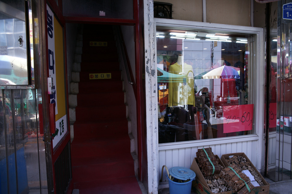 옷가게 옆에 있는 계단에는 서울에서는 보기 힘든 다방이라는 간판이 보이네요.