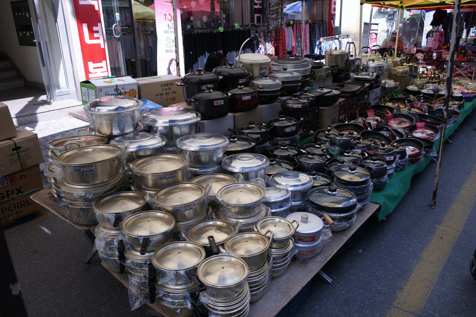 숙녀복을 팔고 있는 옷가게 앞 좌판에는 각종 냄비등의 식기를 팔고 있는 모습이 보입니다.