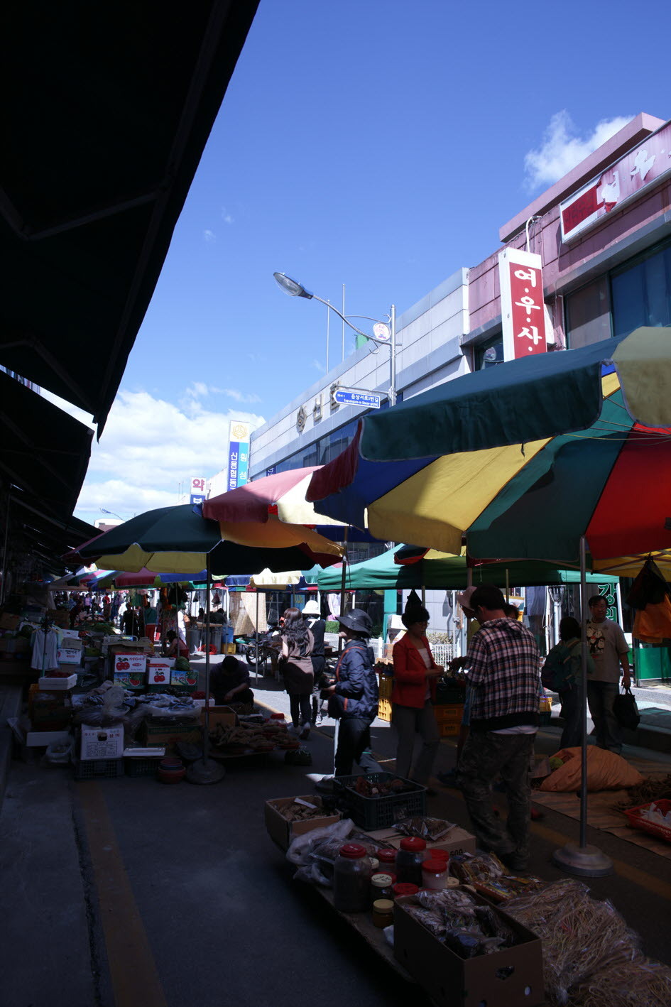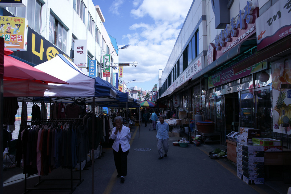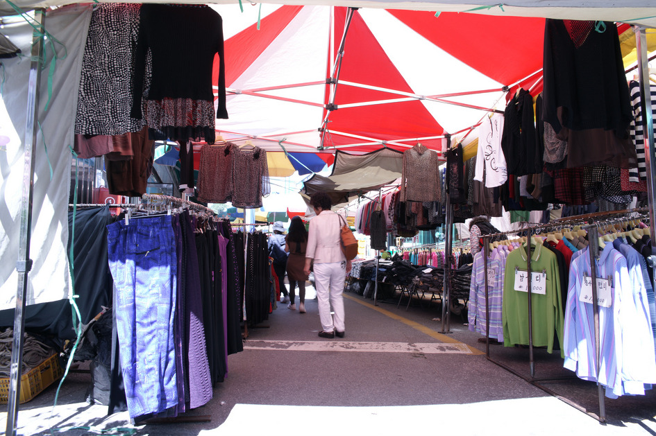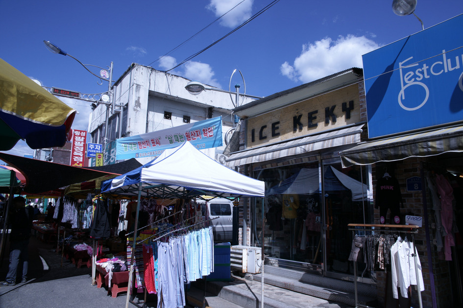 횡성전통시장 안으로 들어가는 길목의 모습입니다. 대형 파라솔아래로 옷을 파는 가게들이 즐비하네요.