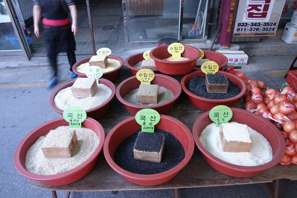 각종 곡물을 팔고 있는 미곡상 앞의 모습입니다. 국산제품도 많지만 수입산도 많이 팔고 있네요.