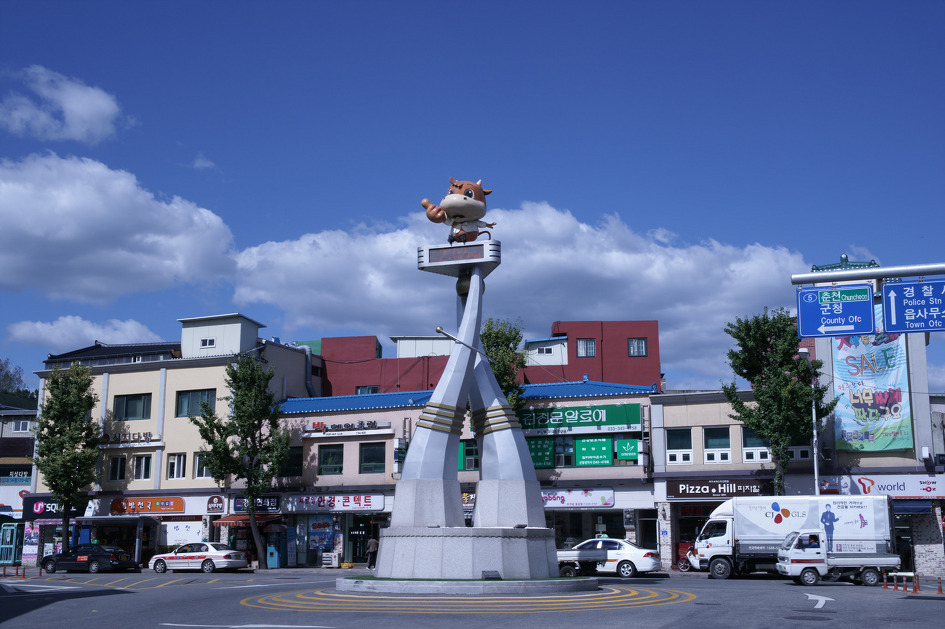 수한 시골 인심과 마음의 여유를 느낄 수 있는 횡성전통시장을 둘러보고 나오다 보니 삼거리 중앙에는 횡성을 상징하는 소 케릭터 탑이 보였습니다.
