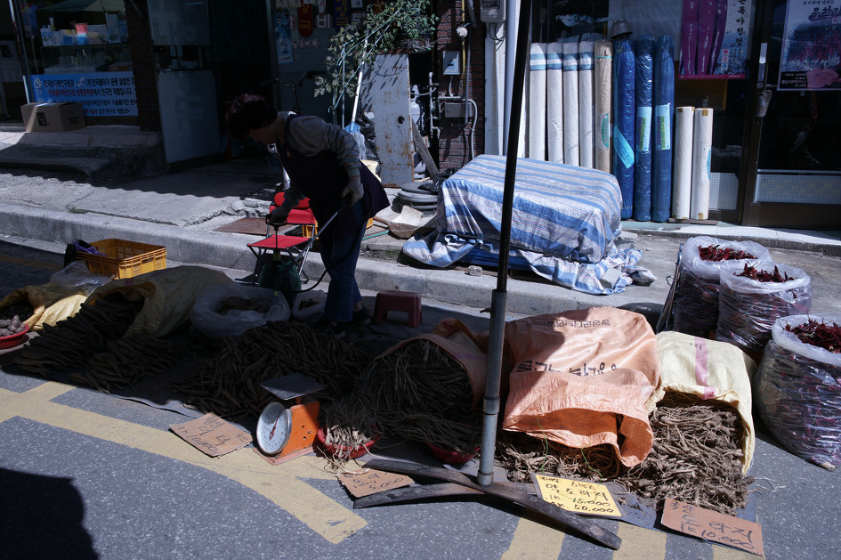 길가 옆에서는 대형파라솔을 피고서 도라지와 더덕을 가마니채로 쌓아놓고서 파는 좌판도 보입니다.