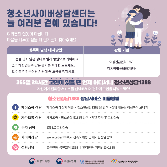 ※ 청소년사이버상담센터는 한국청소년상담복지개발원에서 운영하고 있습니다.
