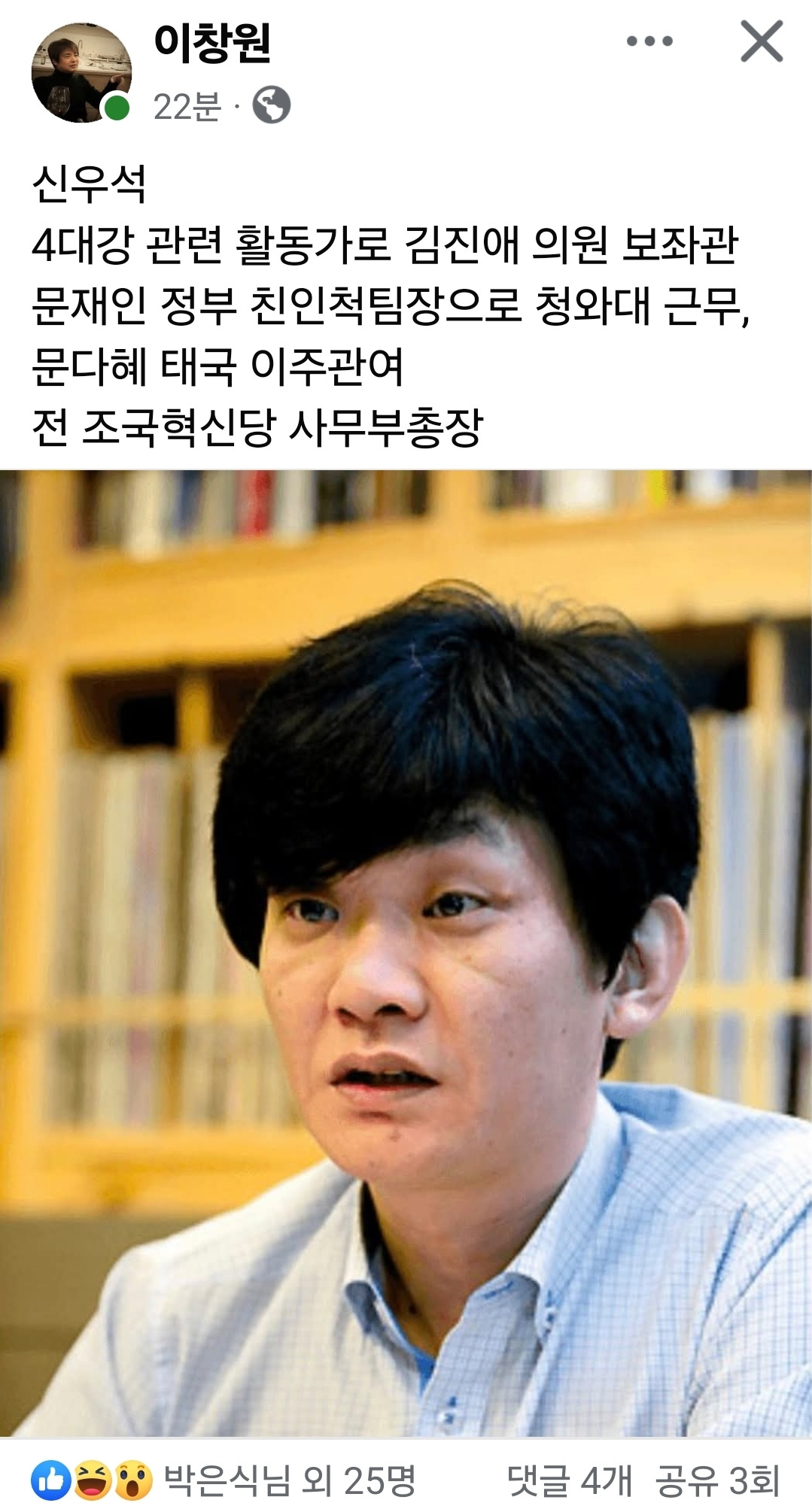 전 조국혁신당 사무부총장 신우석 정체. 작성자개털과범털|작성시간25.09.04|조회수8,422 목록 댓글 0 글자크기 작게가 글자크기 크게가 신우석 정체.4대강 관련 활동가로 김진애 의원 보좌관문재인 정부 친인척팀장으로 청와대 근무, 문다혜 태국 이주관여전 조국혁신당 사무부총장 다음검색 현재 게시글 추가 기능 열기 북마크 공유하기 신고 센터로 신고 댓글 댓글 0 댓글쓰기 답글쓰기 댓글 리스트