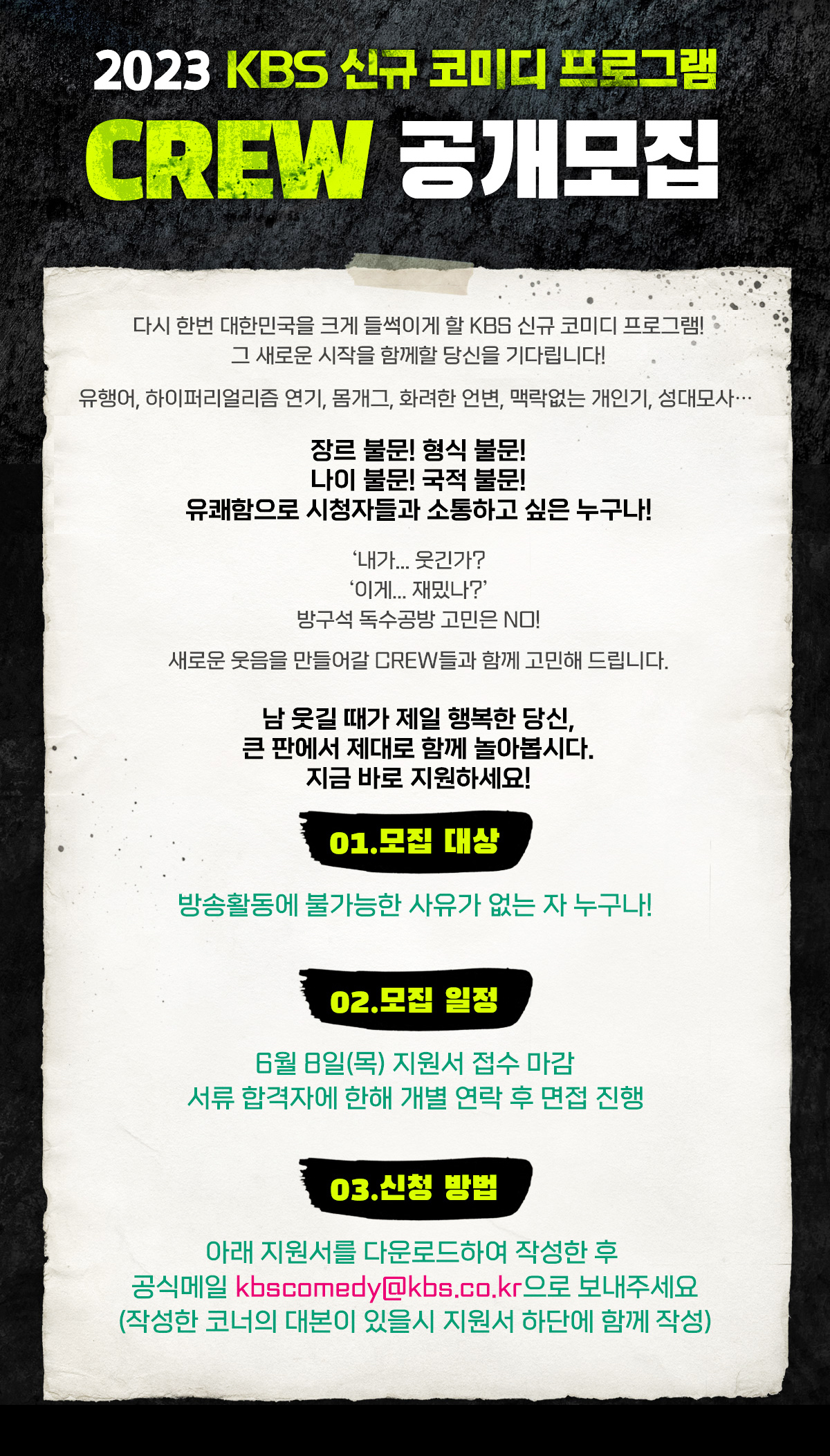 2023 kbs 개그프로 오디션 작성자개그선비|작성시간23.05.31|조회수625 목록 댓글 0 글자크기 작게가 글자크기 크게가 솔직히 이게 공채 개그맨 시험인지 아닌지는 잘 모르겠습니다. 하지만 새로운 개그프로그램이 생기고 출연자를 뽑는 오디션 같습니다. 정확한 내용은 추후 댓글로 남기도록 하겠습니다. 화이팅 입니다. ㅎㅎ 다음검색 현재 게시글 추가 기능 열기 북마크 공유하기 신고 센터로 신고 댓글 댓글 0 댓글쓰기 답글쓰기 댓글 리스트