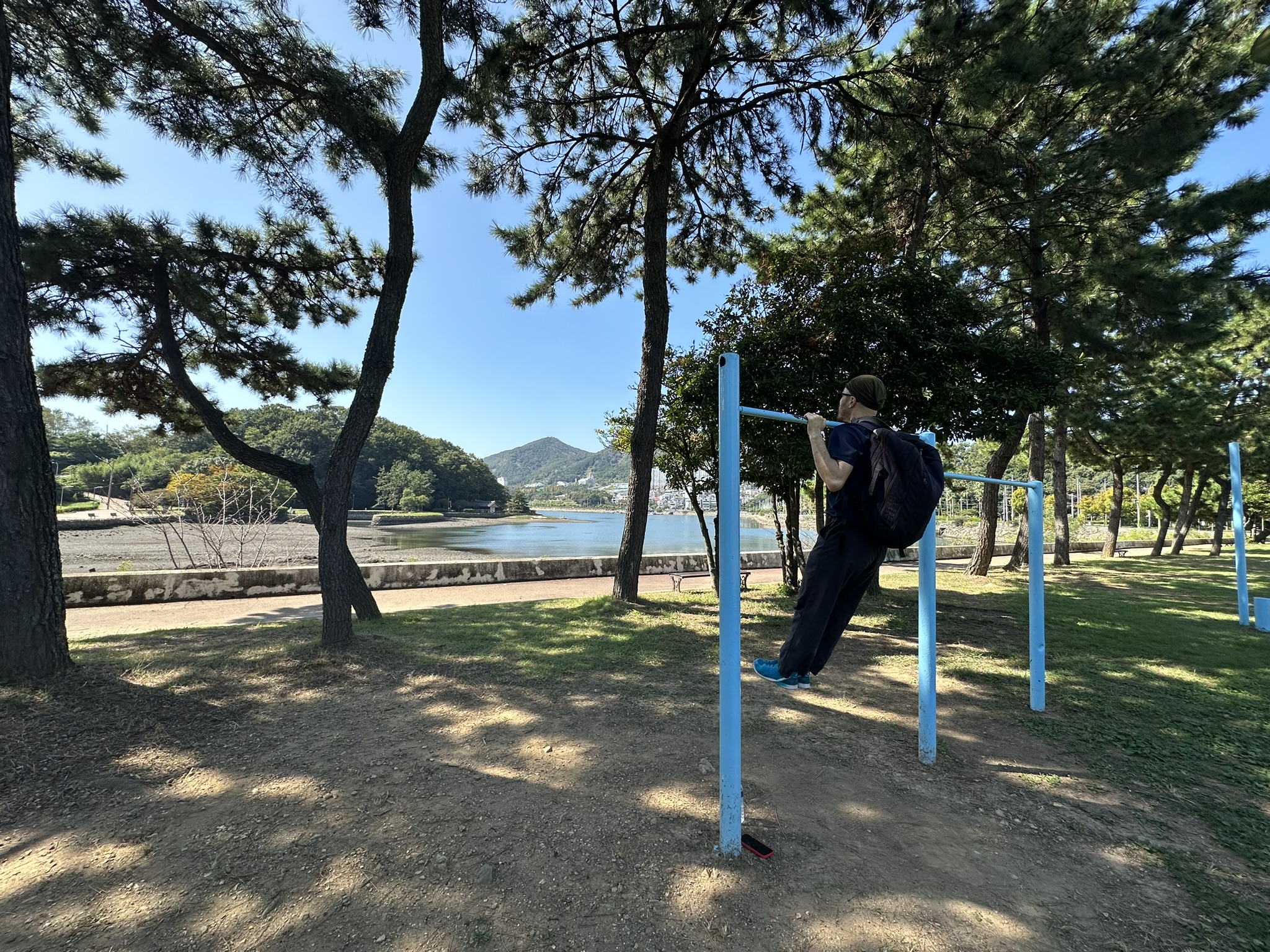❷ 직업이 (대중교통을 이용해) 전국 각지로 교육 가는 건데 외진 곳도 자주 갑니다. 시골길도 걷고 출장지 숙소나 밭두렁 옆길, (운 좋을 땐) 해변, (수도권과 달리 개방돼 있는) 초등학교 운동장에서도 운동하거나 달립니다.