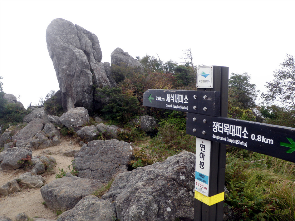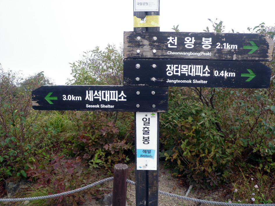 조용히 주위를 살피며 도착한 주능선길에 있는 일출봉 이정표..