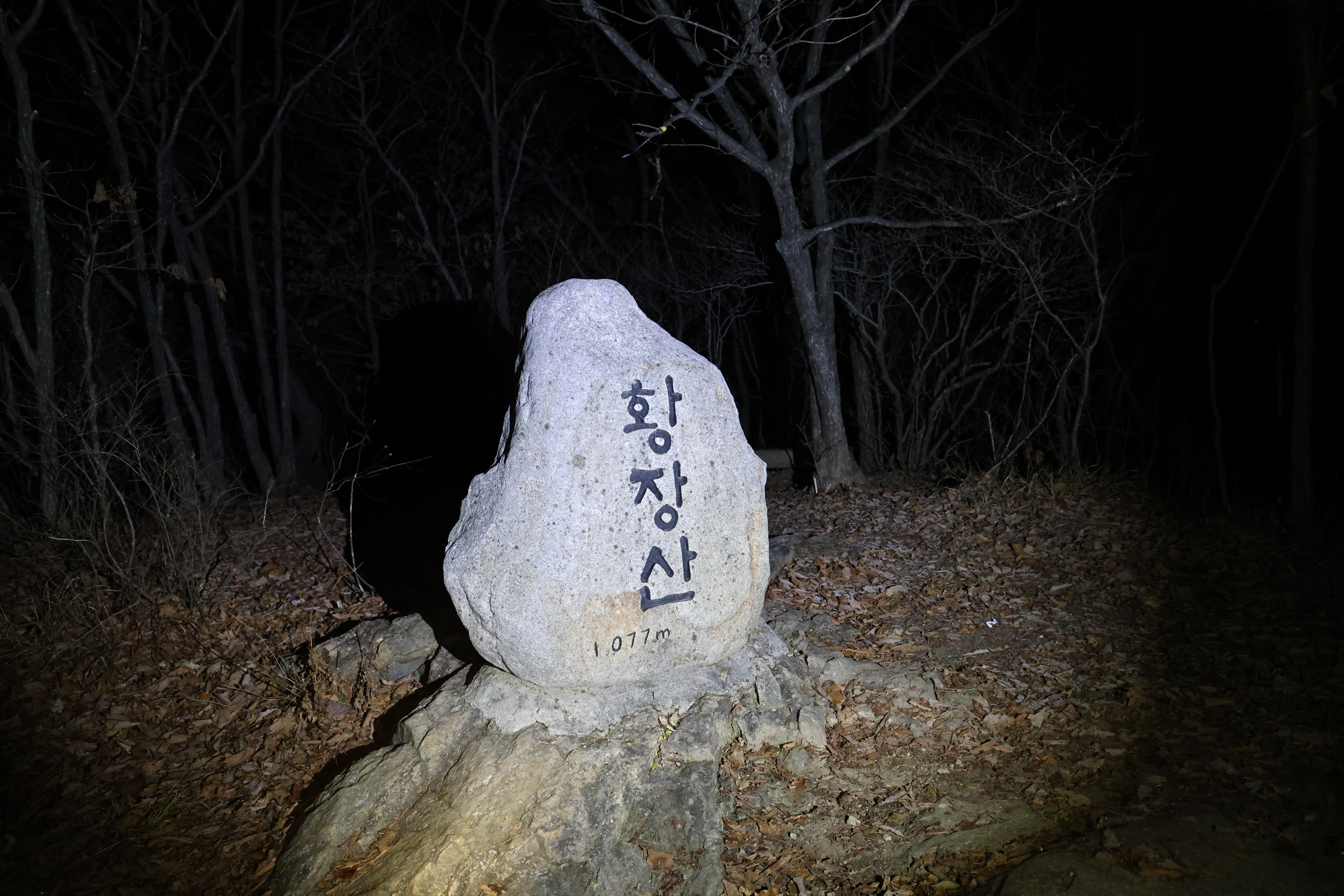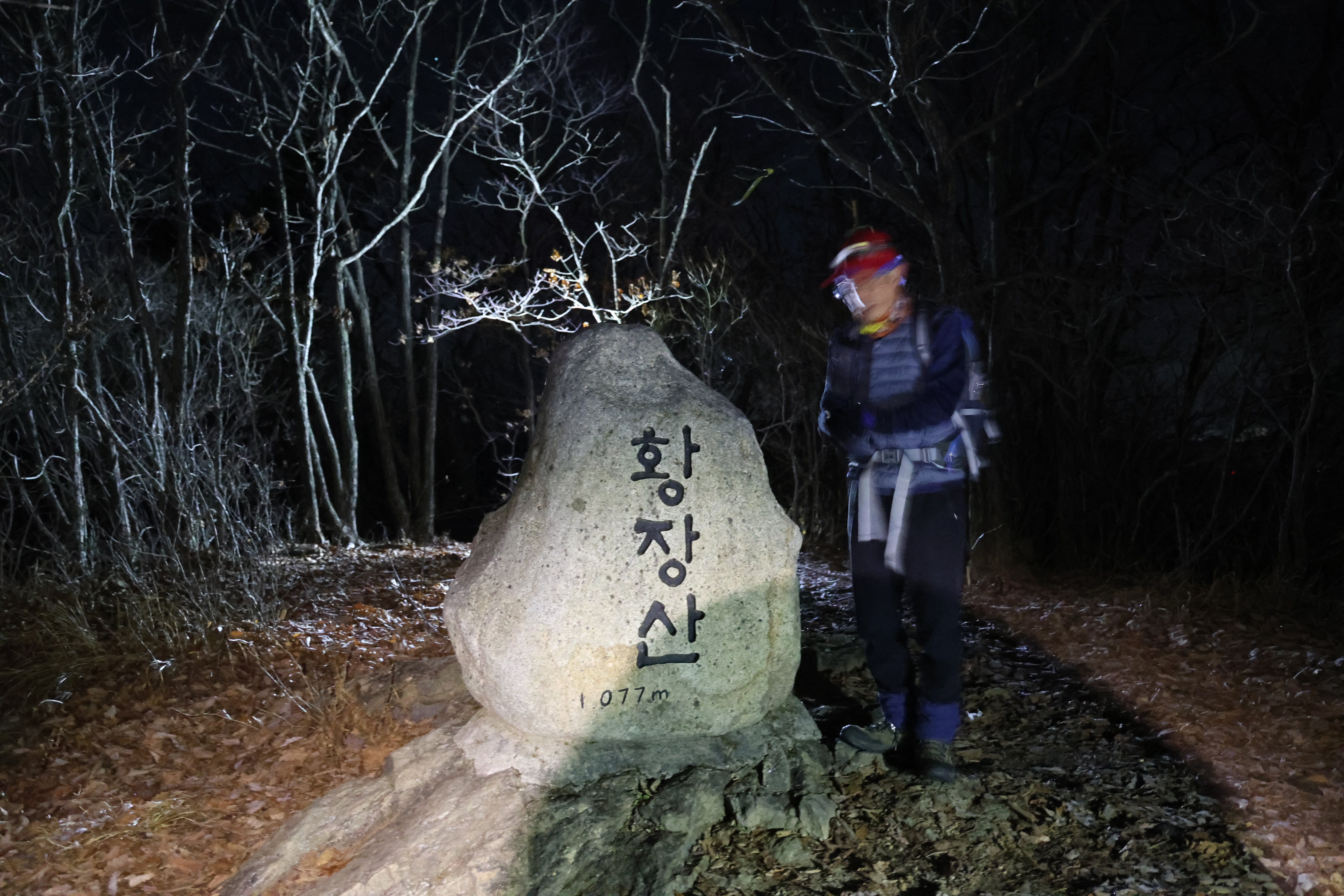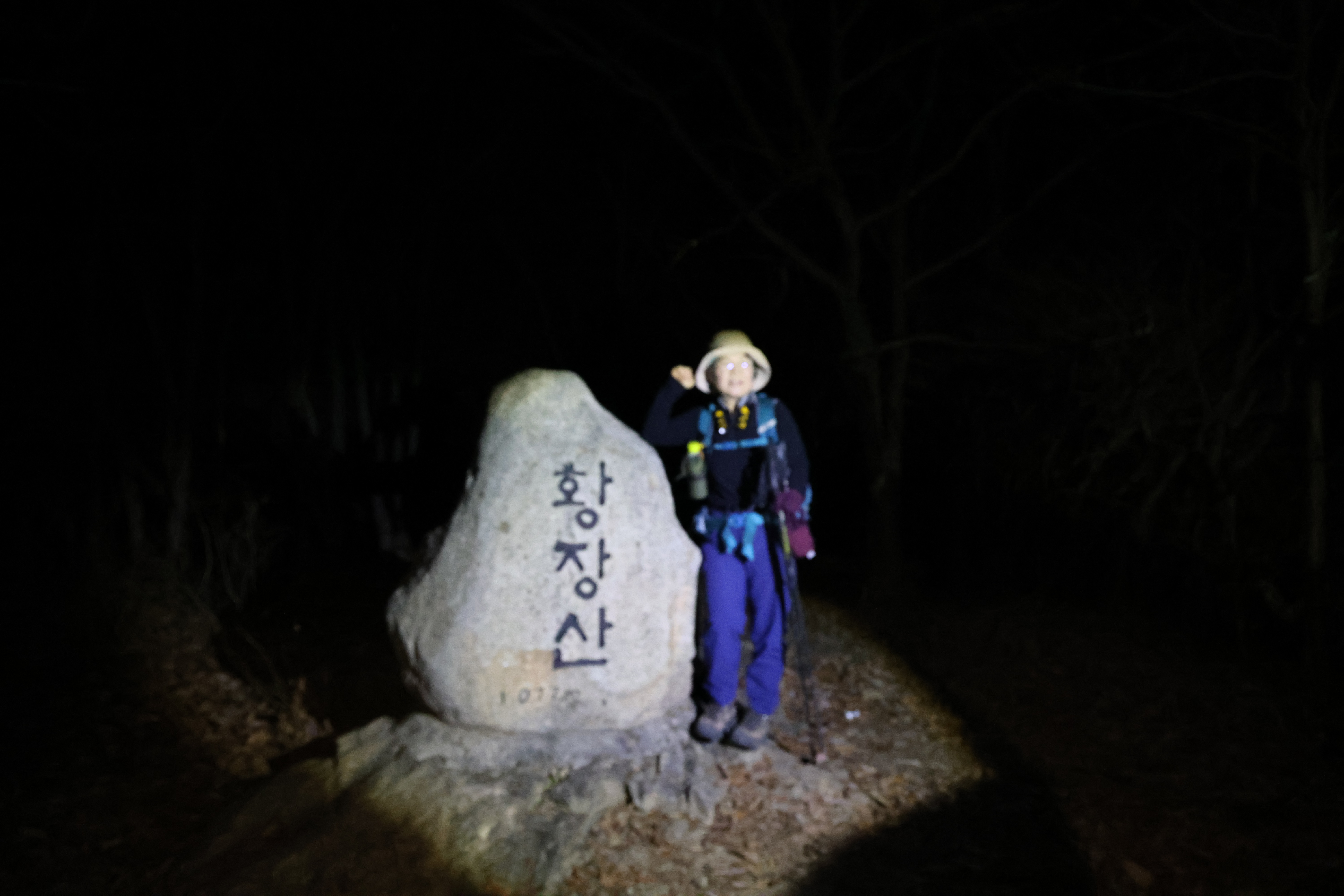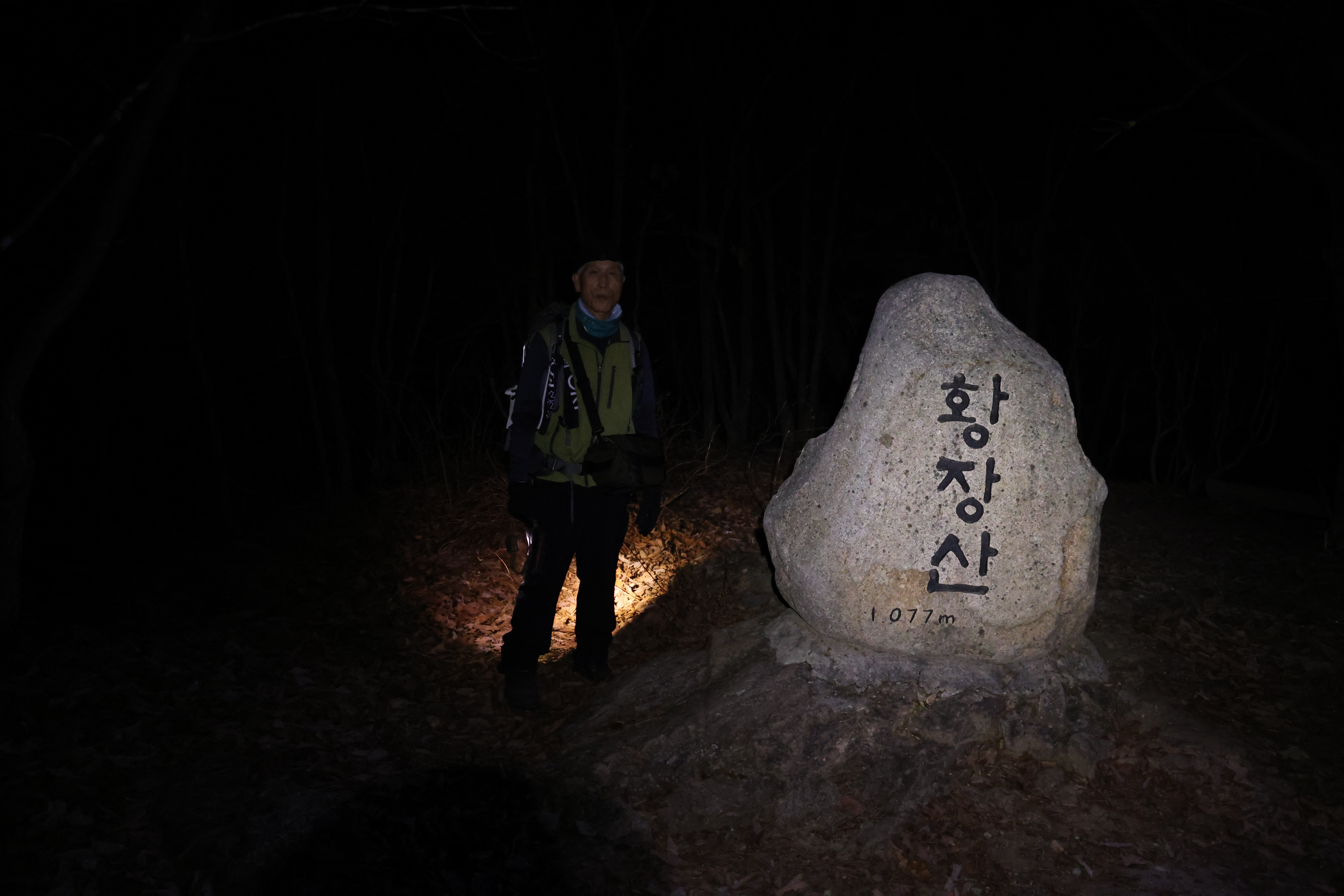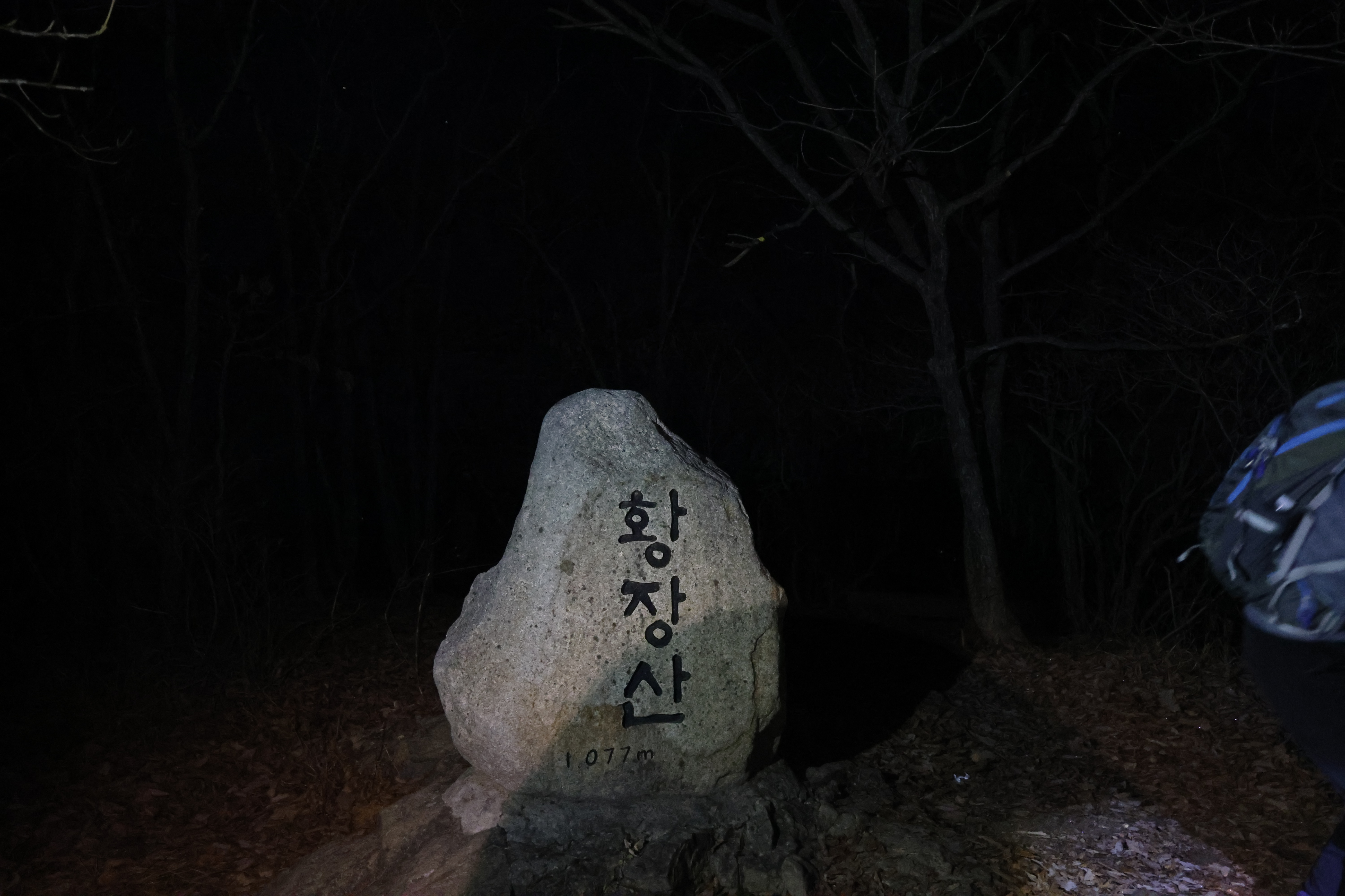 이내 (간이) 헬기장에 닿았고(03:39), 여기서 25분쯤 뒤 황장산(1077m-‘푯돌’)에 닿았다.(04:04)