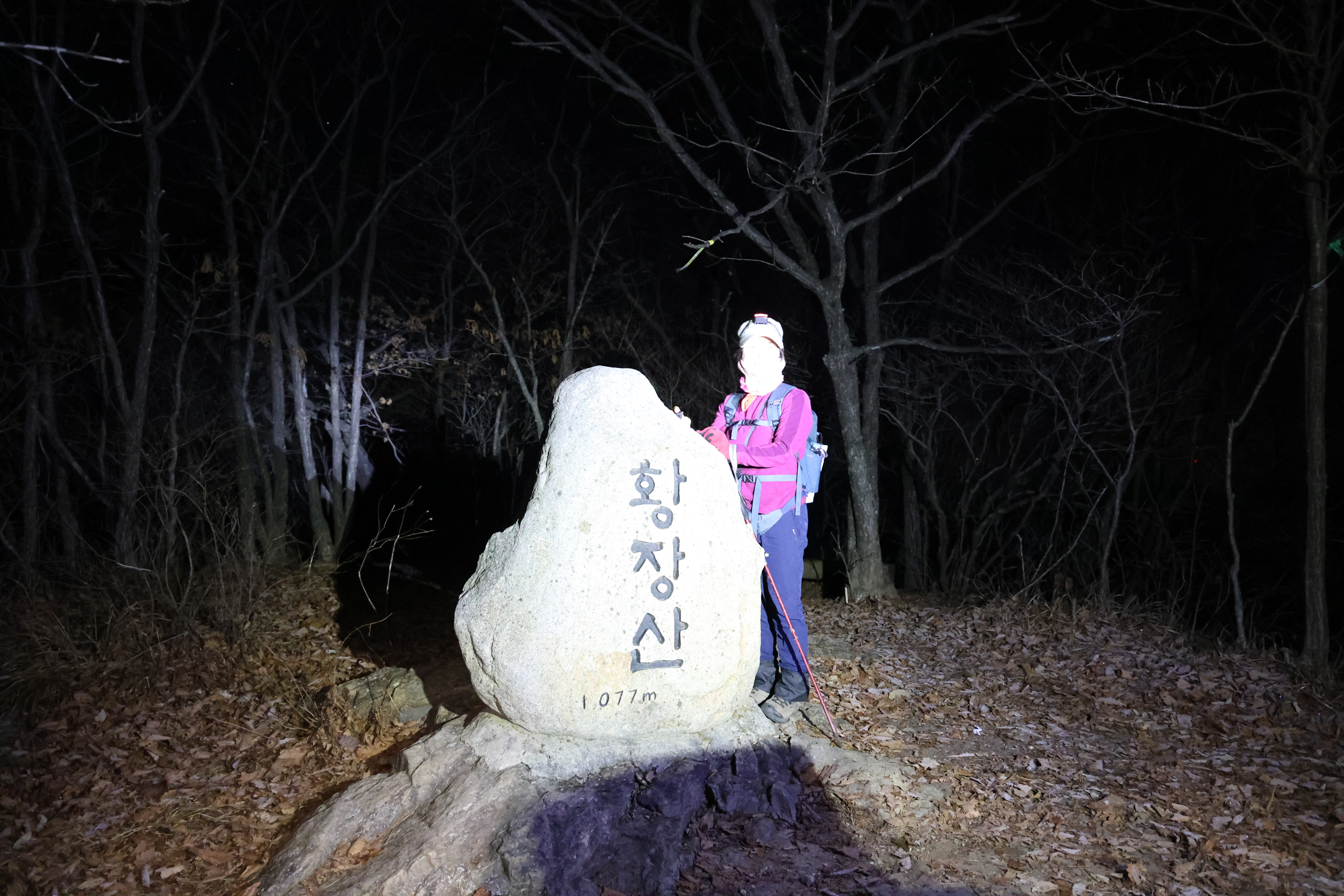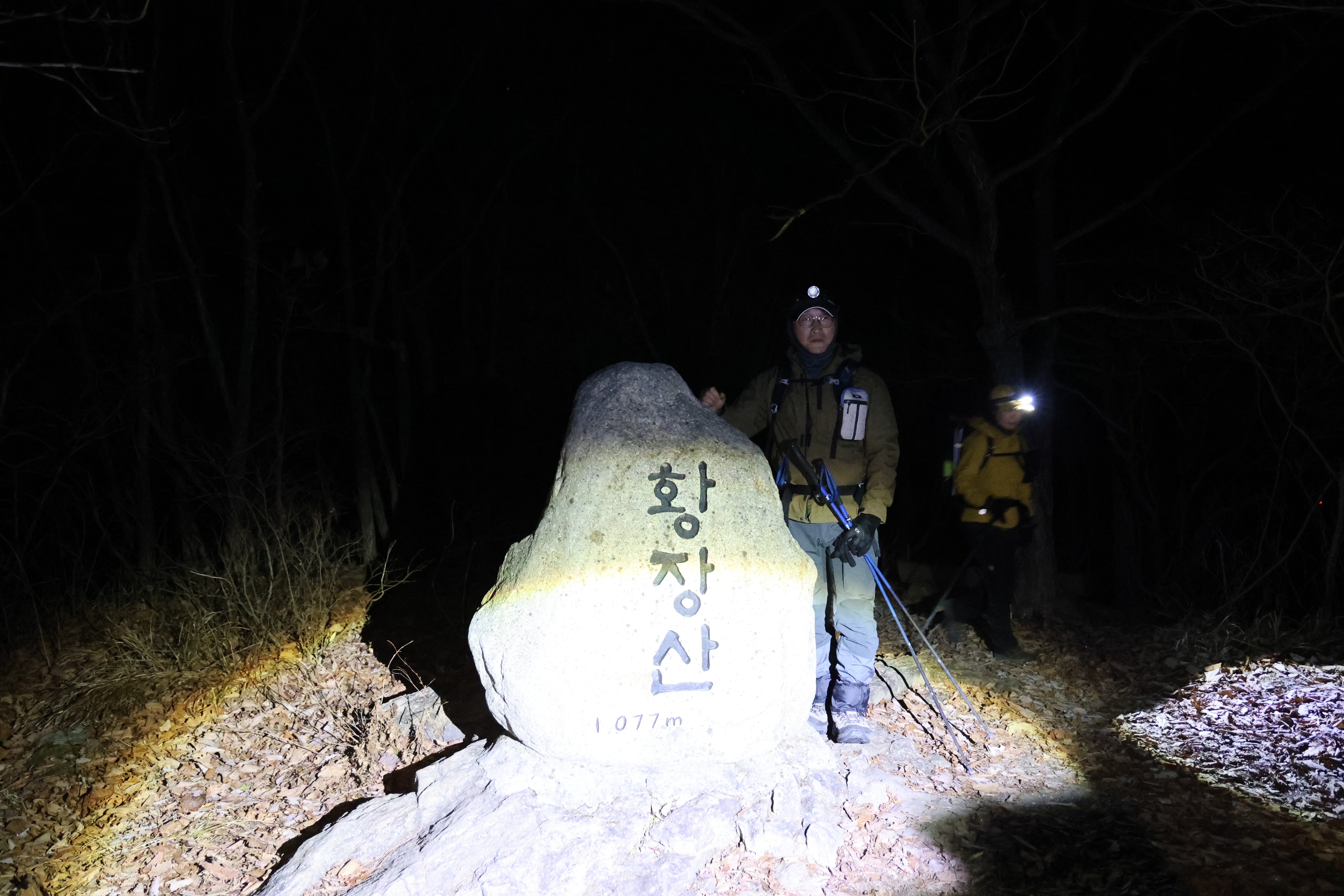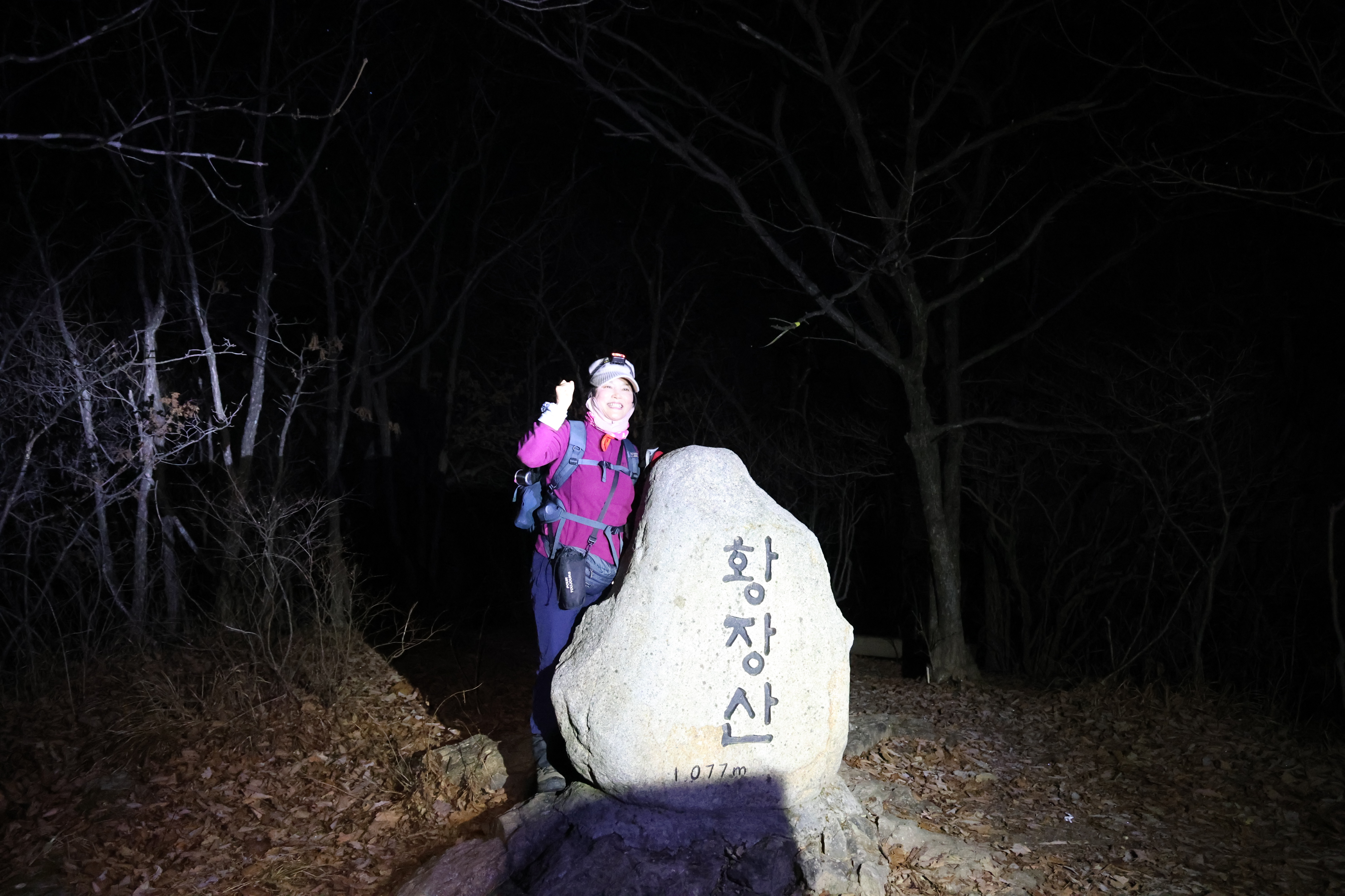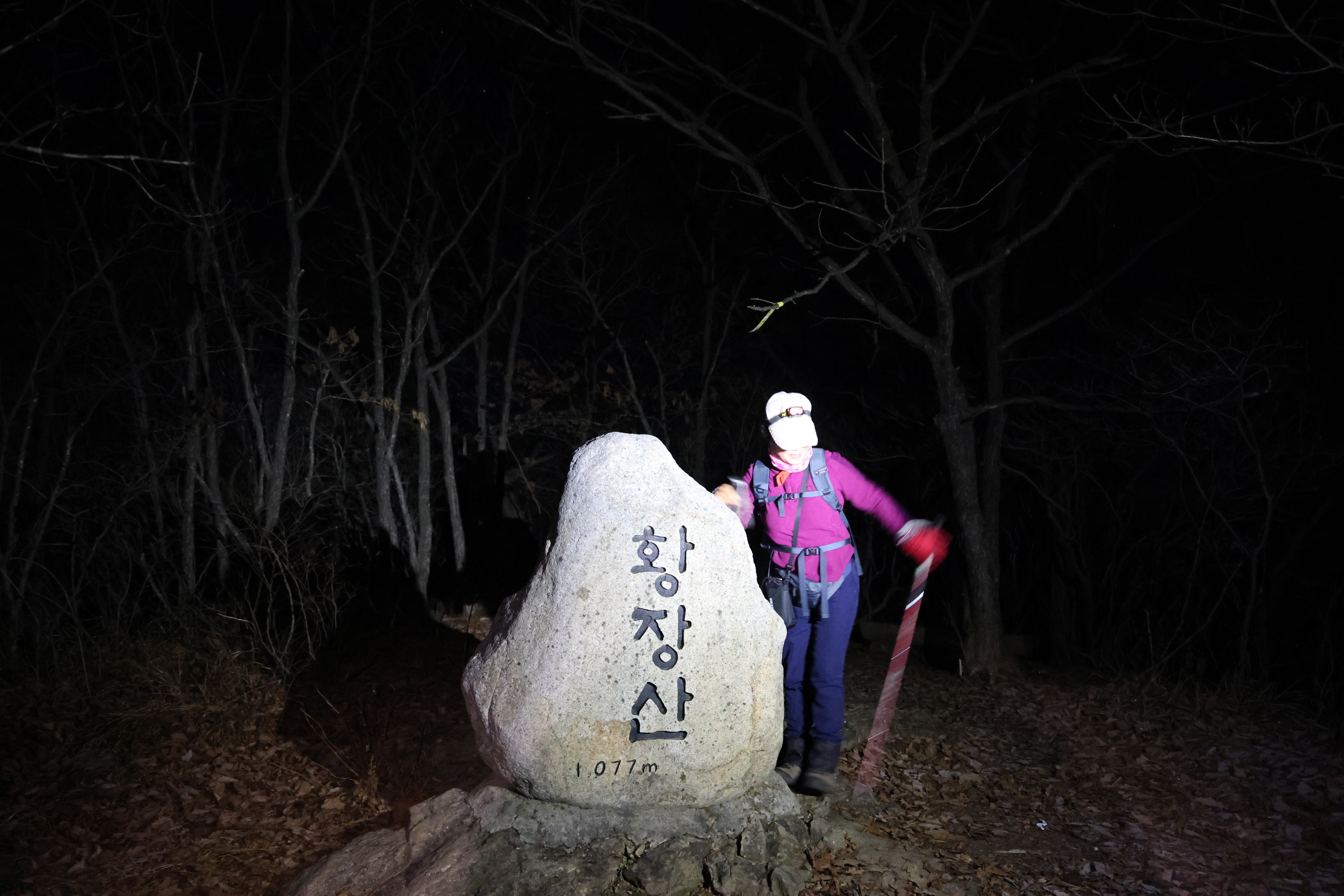 이내 (간이) 헬기장에 닿았고(03:39), 여기서 25분쯤 뒤 황장산(1077m-‘푯돌’)에 닿았다.(04:04)