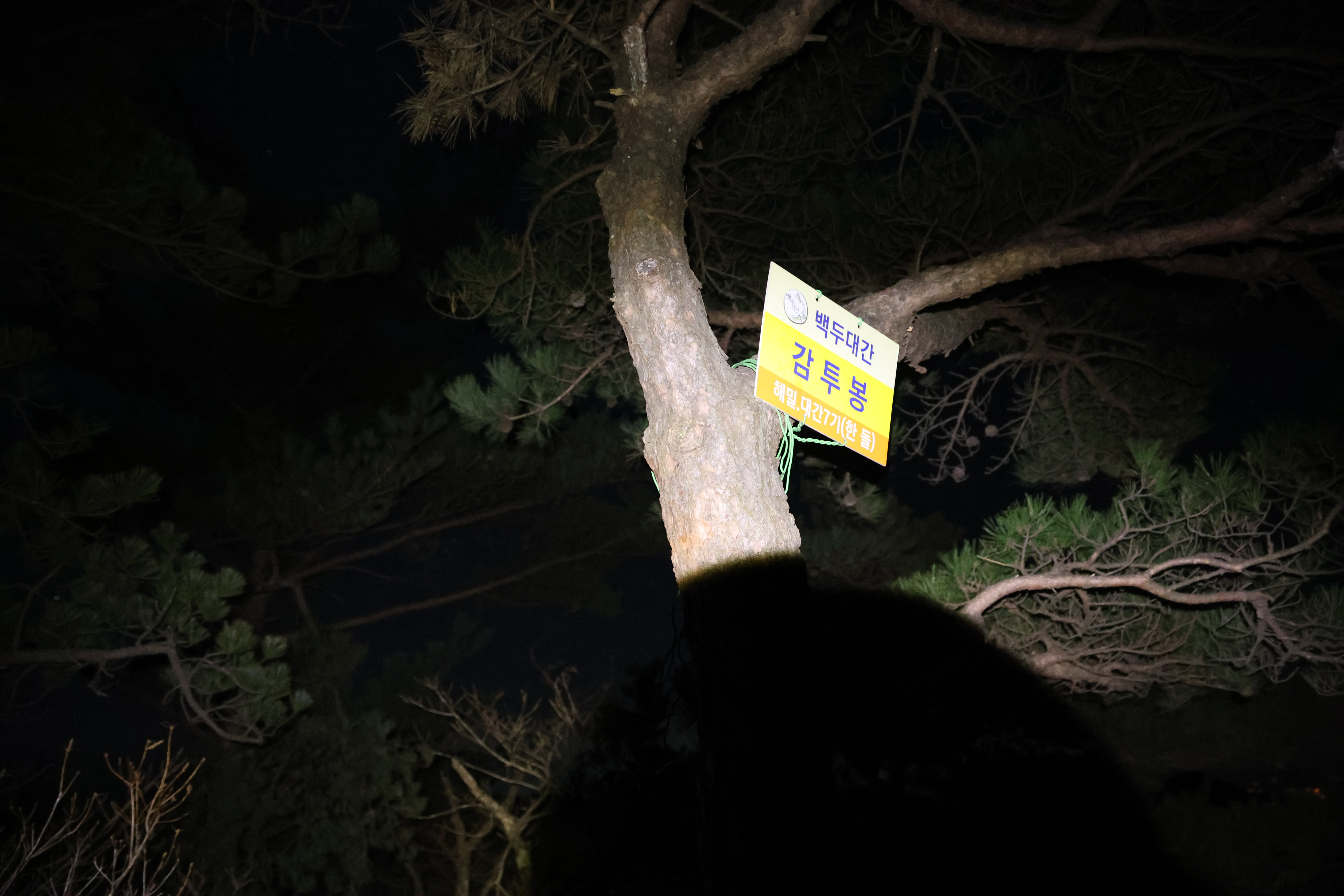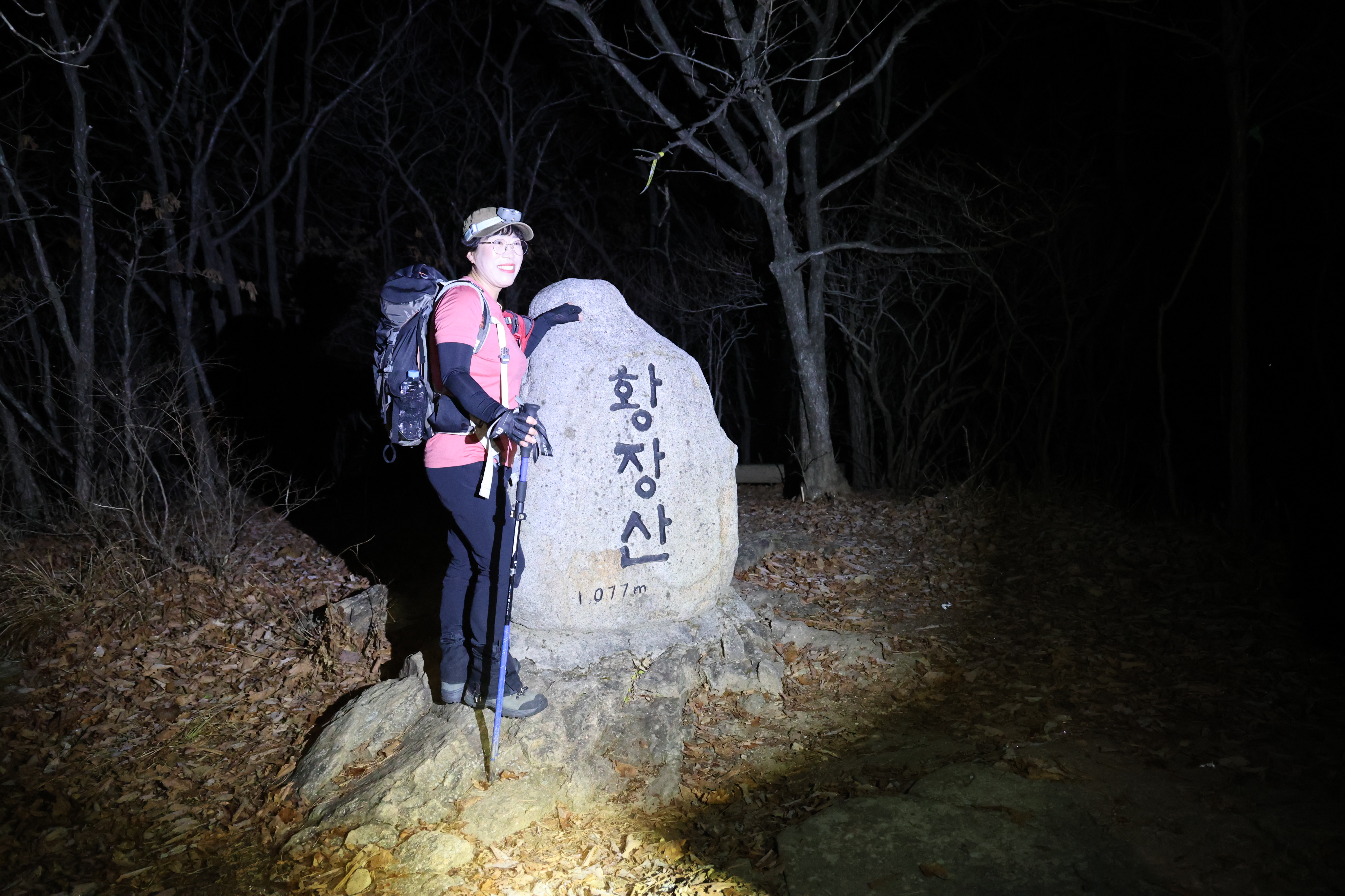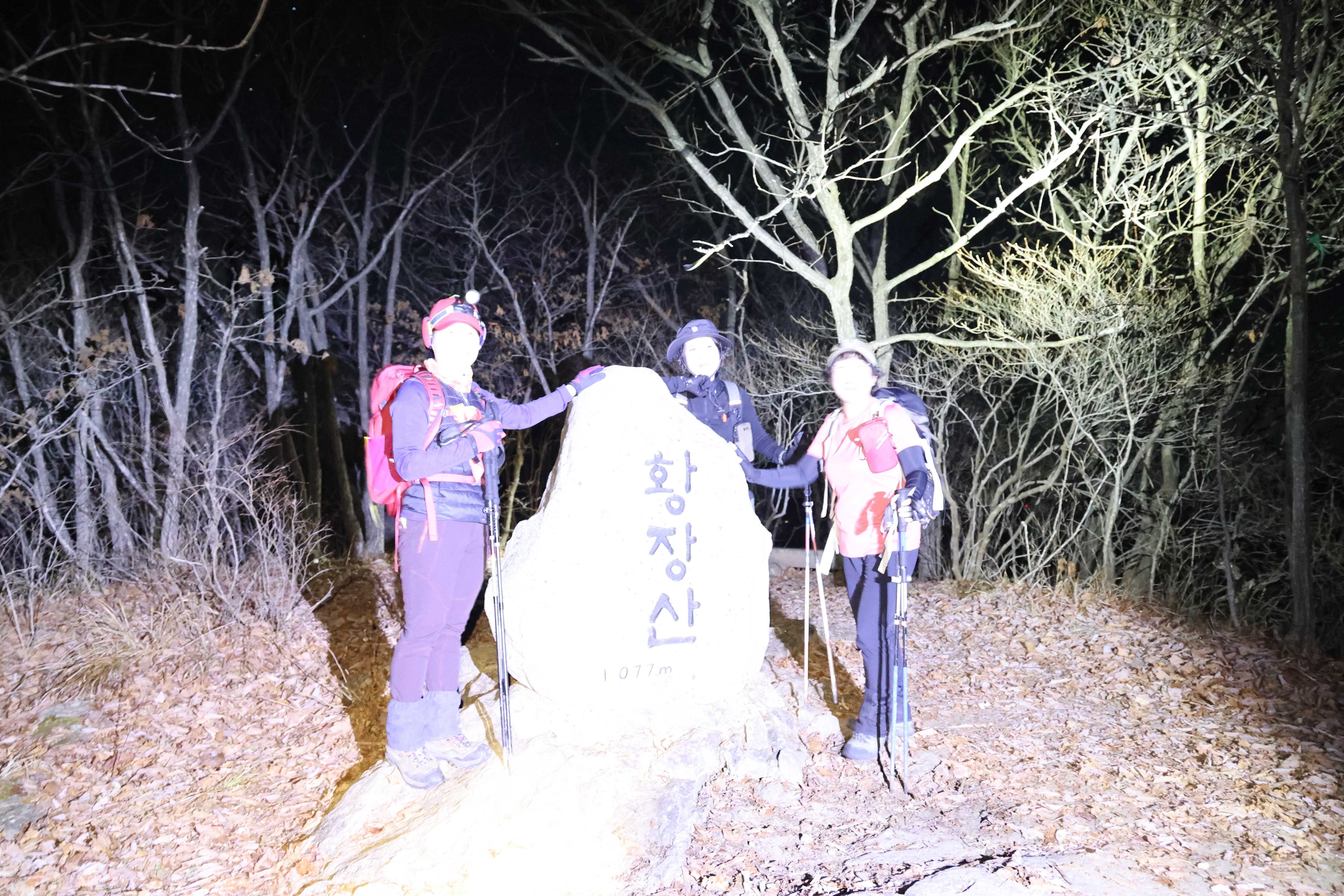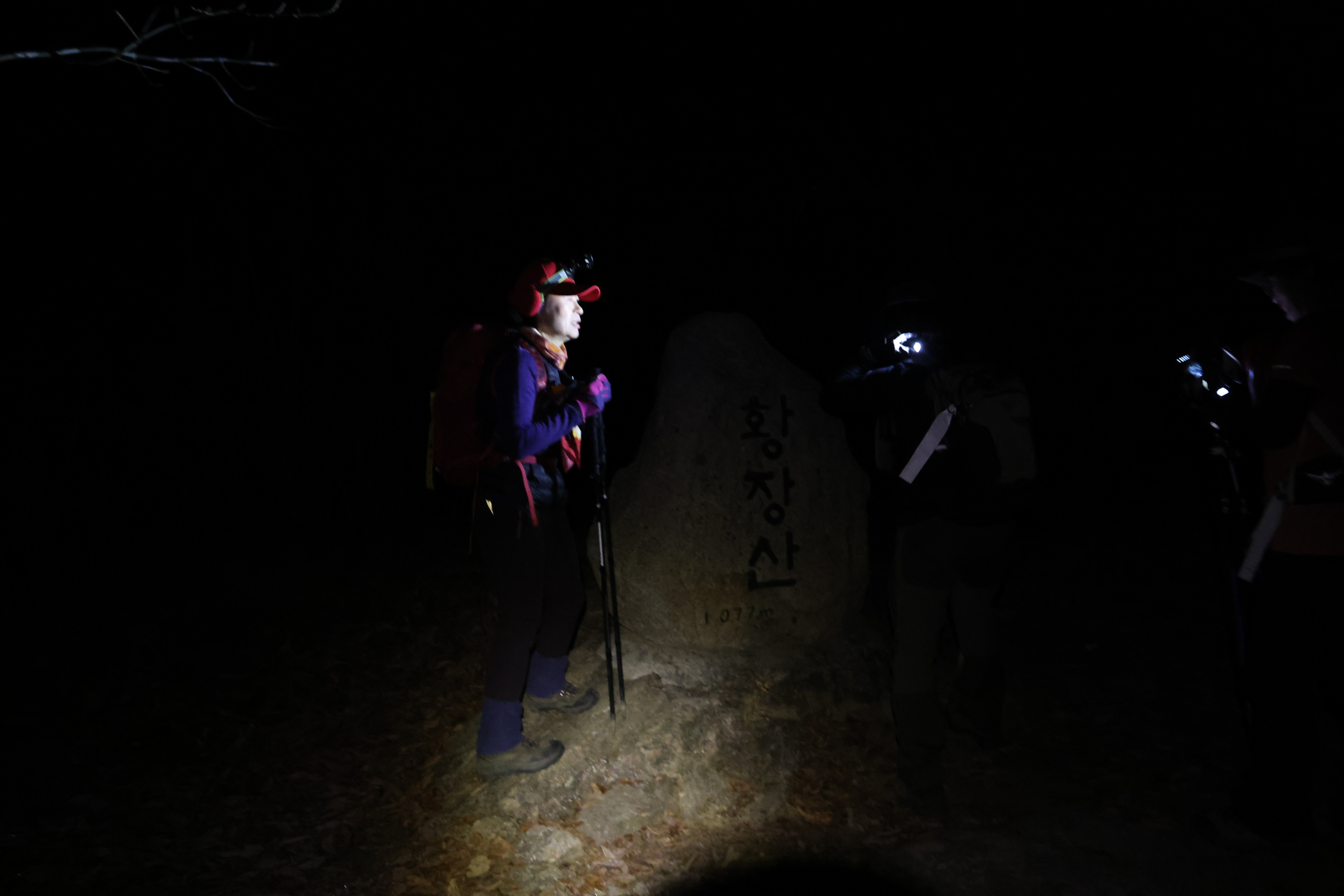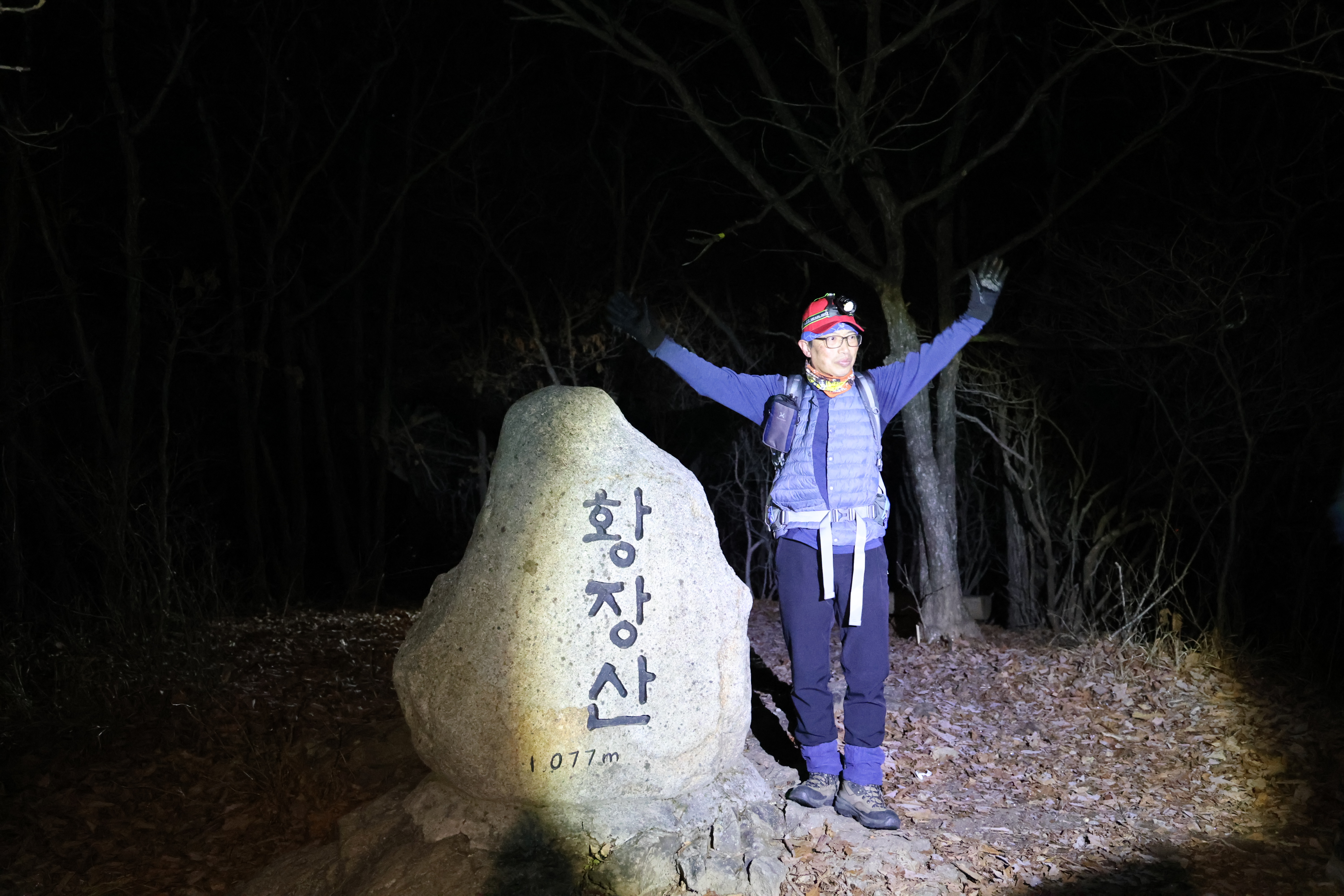 이내 (간이) 헬기장에 닿았고(03:39), 여기서 25분쯤 뒤 황장산(1077m-‘푯돌’)에 닿았다.(04:04)