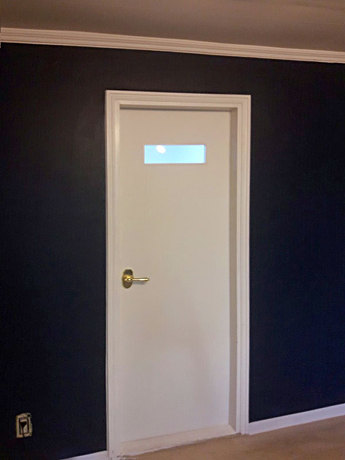 화이트 색상에 상부에 불투명유리가 장착된 화장실문짝 입니다.