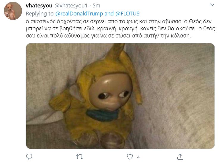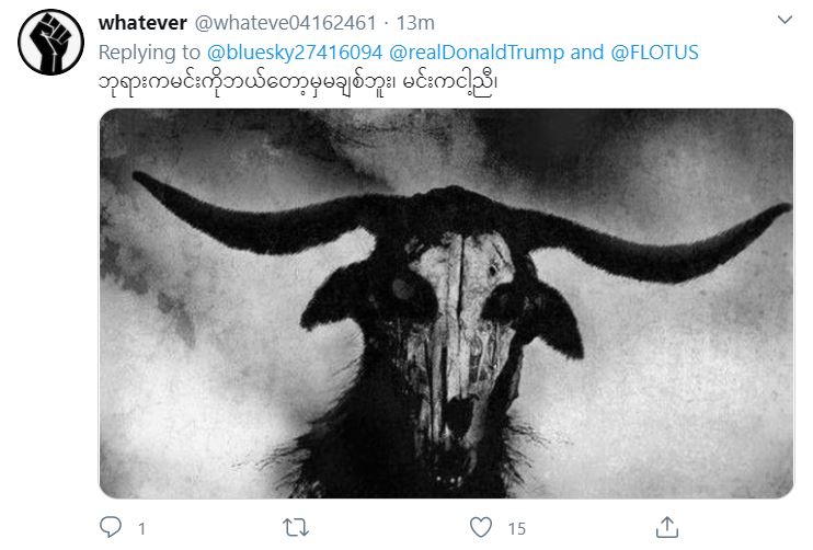 트럼프에 대한 역사적이고 기록을 깨트리는 수준의 트윗은 아람어, 히브리어, 산스크리트어 및 기타 언어로 작성되었는데, 그것은 사탄 이미지와 "저주" 축원을 담은 응답으로 빠르게 넘쳐났습니다. 일부는 트롤 또는 "틱톡 키즈 Tik Tok kids"에 의해 게시된 것으로 보이지만, 대부분은 사전 활동이 없는 자동화된 봇 및 기이한 계정에서 나온 것입니다.