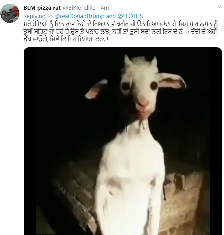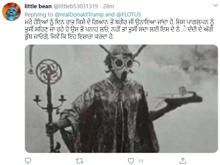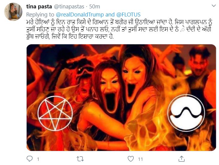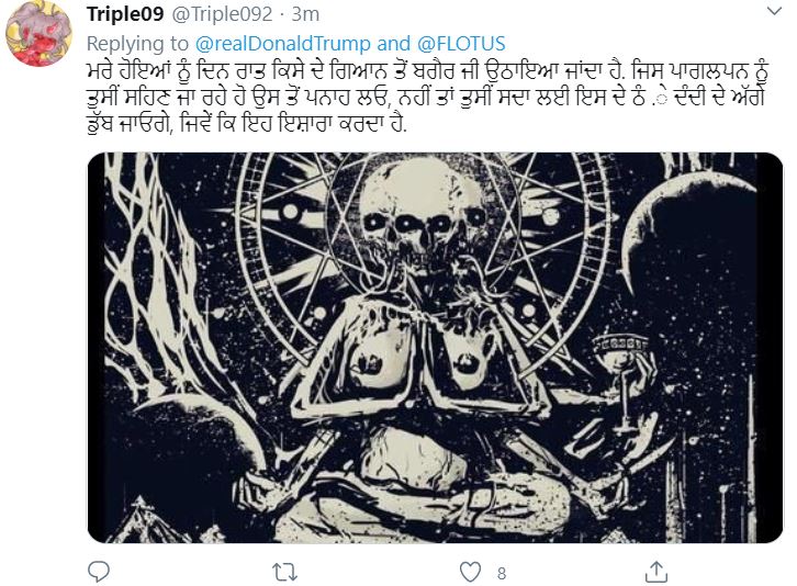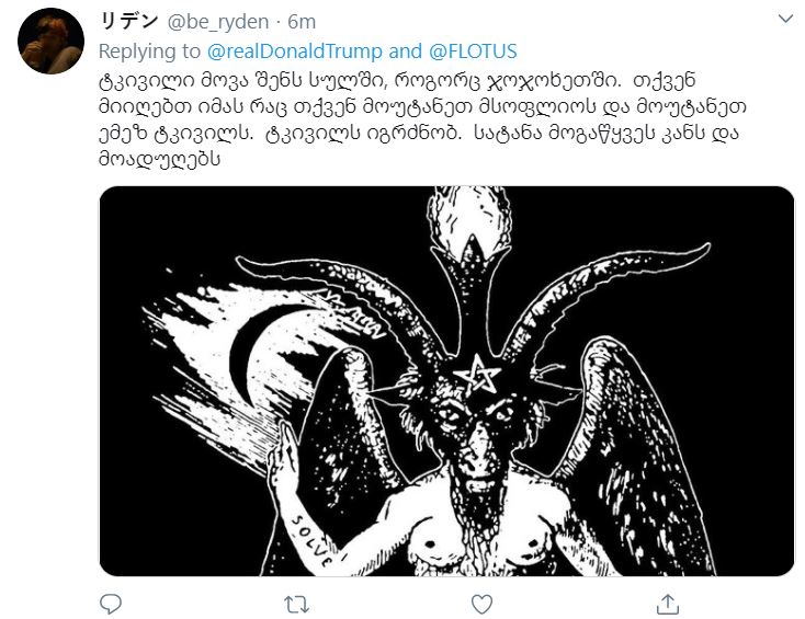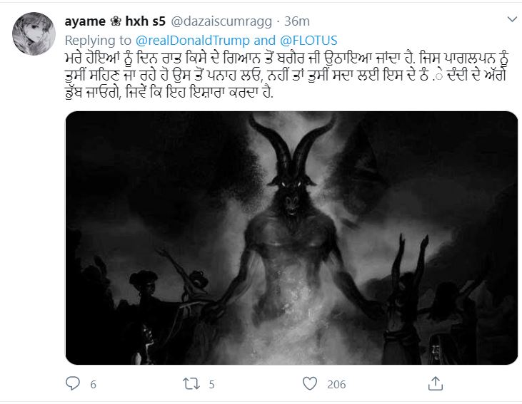 Trump's historical and record-breaking tweet was quickly flooded with replies consisting of satanic images and "curses" written in Aramaic, Hebrew, Sanskrit, and other languages. While some appear to be posted by trolls or "Tik Tok kids", many of them originate from automated bots and bizarre accounts with no prior activity.