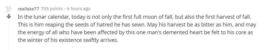 음력으로, 오늘은 가을의 최초 보름달이며 그뿐 아니라, 가을의 첫번 추수이다. 이것은 트럼프가 뿌린 증오의 씨앗을 그가 거두는 것이다. 그의 추수는 그 만큼 통렬한 것이 되기를, 그리고 그의 정신없는 심정에 영향을 받은 모든 에너지가 그의 심장에 느껴지기를 바란다. 그의 존재에 급하게 쇄도할 겨울처럼 말이다.