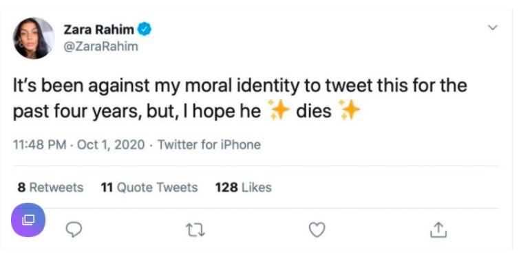 Zara Rahim. who worked with Obama, Clinton, and Vogue magazine wished death on Trump. The tweet was deleted after some backlash.