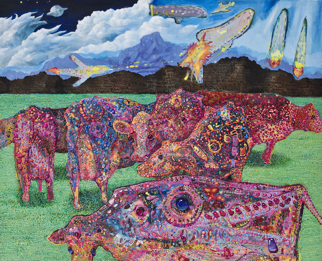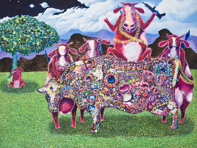 갤러리담에서 김명규의 <그들의 생각과 상관없이展>이 열린다. 그들이란 작가가 은유적으로 등장시킨 소, 새, 코알라 등을 말한다. 소는 인간들에 의해서 온갖 노동을 착취당하고는 그들의 살과 뼈, 심지어는 살가죽까지 온갖 것들을 내놓고는 죽어간다. 작가는 이러한 소들에게 빛나는 보석으로 치장한 훈장을 부여하고 이들을 둘러싼 자연 속에 인간들이 저지르고 있는 전쟁에 대한 경고를 하고 있다. 때로는 코알라, 새들이 등장시켜서 자연 속에서 그들 나름대로 평화롭게 살기를 원하는 모습을 그려내고 있다.