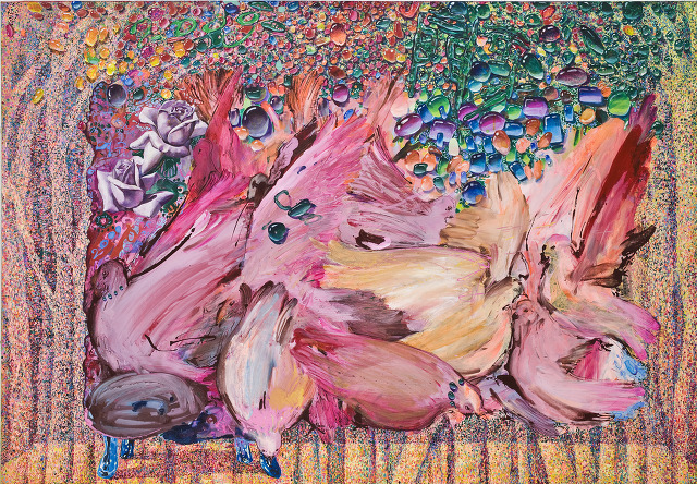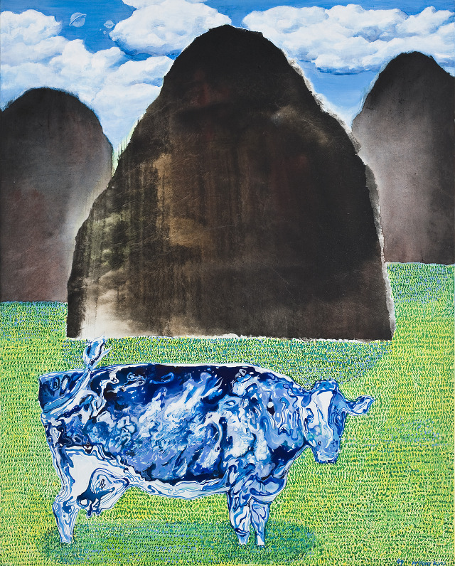 이번 전시는 상상화이다. 모델을 구하지 않고 열심히 주물락 그려 만든 작품들이다. 그래서 오히려 더 자유롭다. 아무렇게나 떨어뜨린 안료 위에 의도하지 않은 흔적들을 이용해 금속성이나 아님 색이 들어간 물방울처럼 반짝이게 표현 하였다. 소들도 새들도 코알라도 그렇게 탄생했다. 그들의 외피가 털이 아닌 특별한 가죽으로 재생산 된 것이다. 아무런 계획없는 우연한 흔적들을 이용하는 방법이었다.