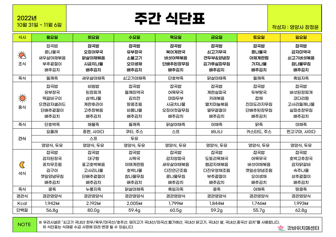 2022년 11월 첫째주 식단표 작성자감천복지재단|작성시간22.10.28|조회수19 목록 댓글 0 글자크기 작게가 글자크기 크게가 ※ 사진을 클릭하시면 더 큰 사이즈로 보실 수 있습니다. 다음검색 현재 게시글 추가 기능 열기 북마크 공유하기 신고 센터로 신고 댓글 댓글 0 댓글쓰기 답글쓰기 댓글 리스트