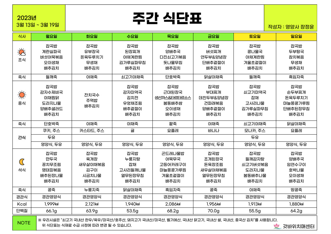 2023년 3월 셋째주 식단표 작성자감천복지재단|작성시간23.03.10|조회수32 목록 댓글 0 글자크기 작게가 글자크기 크게가 ※ 사진을 클릭하시면 더 큰 사이즈로 보실 수 있습니다. 다음검색 현재 게시글 추가 기능 열기 북마크 공유하기 신고 센터로 신고 댓글 댓글 0 댓글쓰기 답글쓰기 댓글 리스트