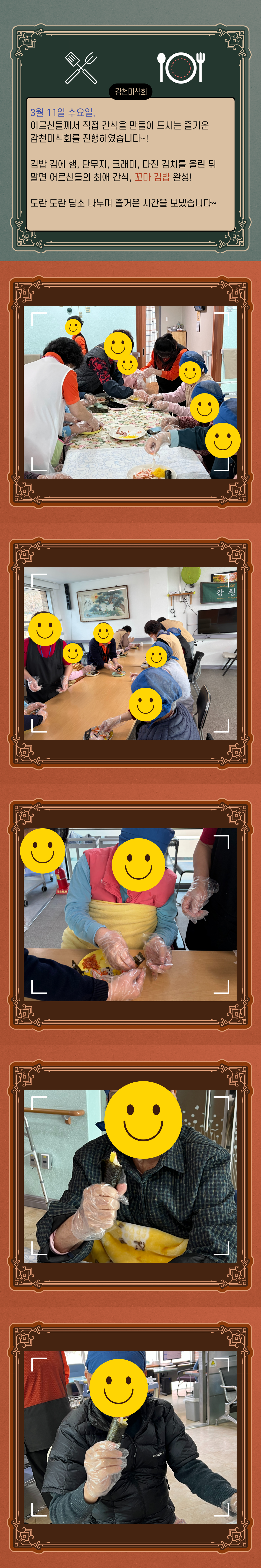 [붓다의집][감천 미식회] 2026년 3월 11일 프로그램(꼬마 김밥) 작성자감천복지재단|작성시간26.03.20|조회수16 목록 댓글 0 글자크기 작게가 글자크기 크게가 #대구요양원 #감천복지재단 #붓다의집 #갓바위요양원 #노인복지시설 #대구동구요양원 #치매요양원 #진인동 #요양원비용 #노인요양원 #치매예방 #노인복지시설 #장기요양 다음검색 현재 게시글 추가 기능 열기 북마크 공유하기 신고 센터로 신고 댓글 댓글 0 댓글쓰기 답글쓰기 댓글 리스트
