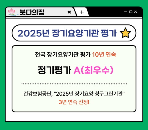 [붓다의집] 2025년 장기요양기관 평가 결과 "A(최우수)" 작성자감천복지재단|작성시간26.03.19|조회수13 목록 댓글 0 글자크기 작게가 글자크기 크게가 국민건강보험공단에서 주관하는 2025년 전국 장기요양기관 정기평가 결과 "A(최우수)"를 받았습니다!앞으로도 최선을 다하는 붓다의집이 되겠습니다. 다음검색 현재 게시글 추가 기능 열기 북마크 공유하기 신고 센터로 신고 댓글 댓글 0 댓글쓰기 답글쓰기 댓글 리스트