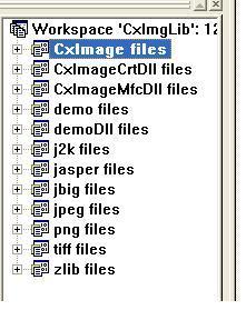 이것이 CxImage 라이브러리를 열었을 때의 file view의 모습인데 여기에서 위의 3가지를 Build해 주어야 한다. 그 아래에 있는 파일들은 위의 3개에 include등으로 포함되어 같이 build 되므로 괜찮다.