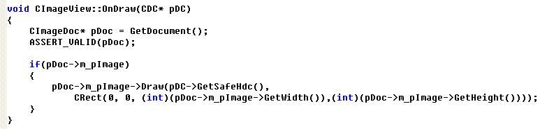 여기가 파일을 화면에 뿌려주는 OnDraw함수이다. GetDocument함수로부터 인스턴스를 받아오고 역시 CxImage의 함수인 Draw를 이용하여 이미지의 크기값을 CRect에 주어서 화면에 띄우게 된다.
