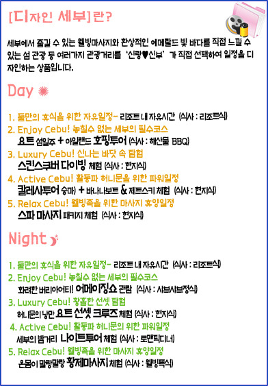♥ 모벤픽 리조트 'Deluxe Plus Sea-view' 이용 ♥ '신랑♡신부'가 직접 일정을 설계하는 [디자인 세부] 프로그램 이용 ♥ 커플당 축의금 500페소 증정 ♥ 전 일정 식사 제공 ♥ 과일바구니 및 와인 제공 ♥ 세부 시내 관광 포함 (마젤란의 십자가, 산페드로 요새, 성어거스틴 교회 등) ♥ 가이드, 운전기사 NO-TIP 행사로 여행경비 절감효과($30~$50)