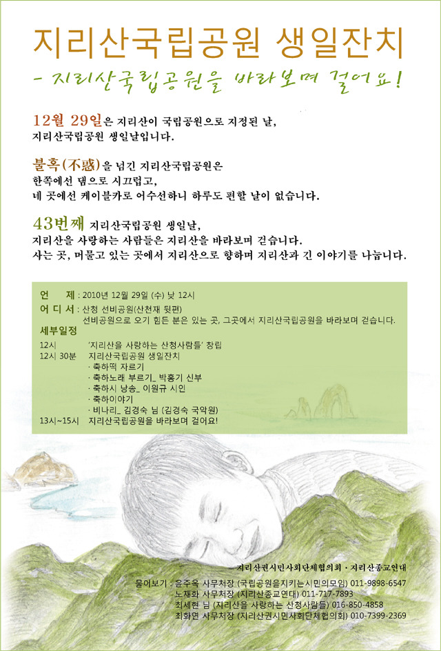 지리산 국립공원 43번째 생일 행사 안내 작성자최세현|작성시간10.12.28|조회수30 목록 댓글 0 글자크기 작게가 글자크기 크게가 . 다음검색 현재 게시글 추가 기능 열기 북마크 공유하기 신고 센터로 신고 댓글 댓글 0 댓글쓰기 답글쓰기 댓글 리스트