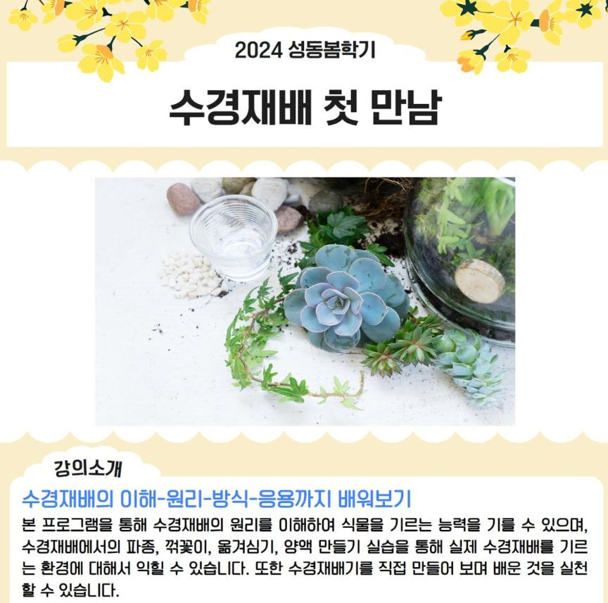 "수경재배 첫 만남(2024년 1기)" @성동50플러스센터 작성자물만난 식물|작성시간25.06.25|조회수28 목록 댓글 0 글자크기 작게가 글자크기 크게가 안녕하세요?2024년 5월에 성동50플러스센터에서 “수경재배 첫 만남” 강의한 내용이 정리되어 공유합니다. {수경재배 첫 만남_poster_2024-04-08.JPG} 링크: https://st4008.tistory.com/775 다음검색 현재 게시글 추가 기능 열기 북마크 공유하기 신고 센터로 신고 댓글 댓글 0 댓글쓰기 답글쓰기 댓글 리스트