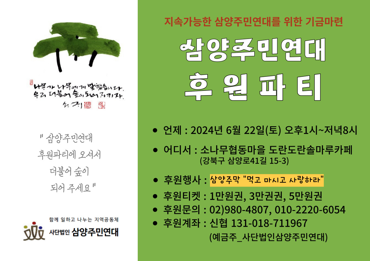 <<삼양주민연대 후원파티에 오셔서 더불어 숲이 되어주세요>>