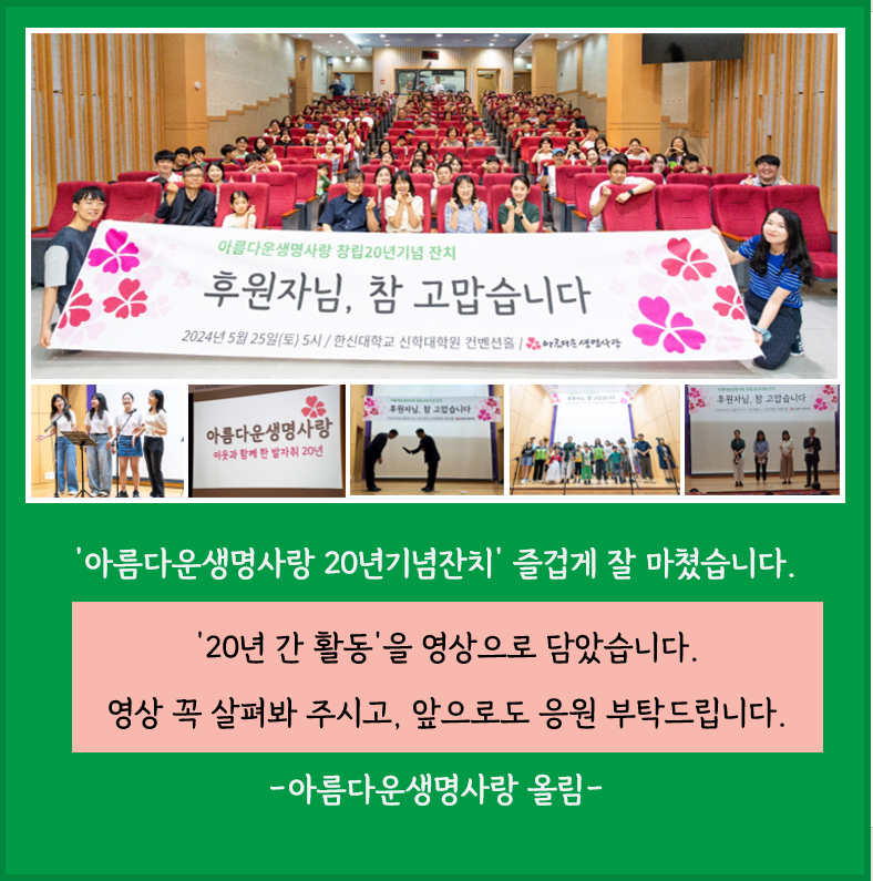 아름다운 생명사랑 창립20주년 기념 작성자강북마을|작성시간24.06.04|조회수26 목록 댓글 0 글자크기 작게가 글자크기 크게가 다음검색 현재 게시글 추가 기능 열기 북마크 공유하기 신고 센터로 신고 댓글 댓글 0 댓글쓰기 답글쓰기 댓글 리스트