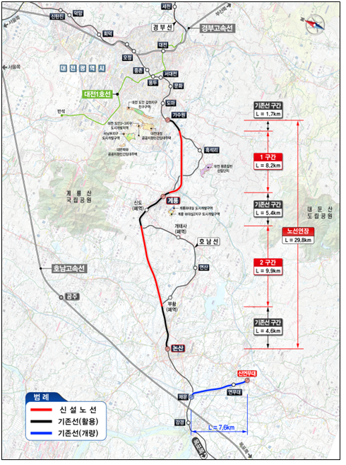 1914년 건설된 호남선 가수원~논산 구간(총 30.8km)의 굴곡진 선형을 직선화하고, 강경선과 연결해 신연무대역을 새로 설치한다. 총사업비 약 9,200억 원을 투입해 2029년 착공, 2034년 완공을 목표로 한다.
