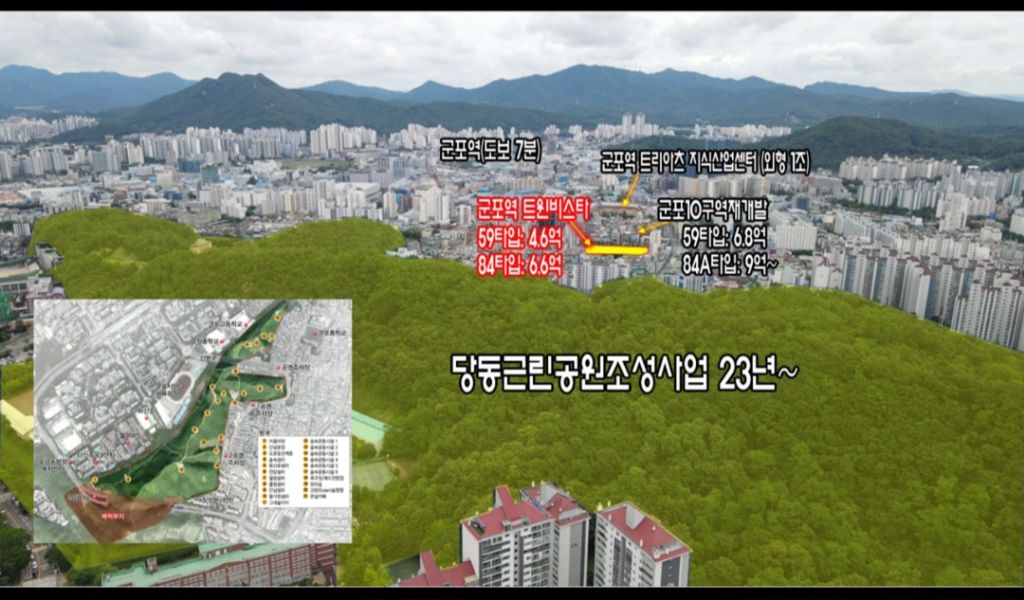 시행지 건너편에 군포 10구역 재개발정비구역이 정비사업을 추진 중이며 2031년 입주예정으로 84m² 일반분양가 9억여원 확정