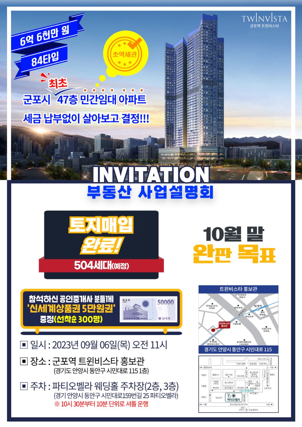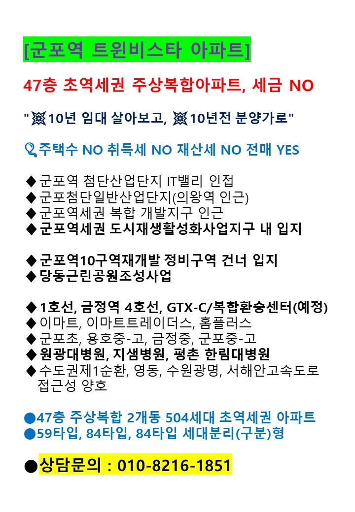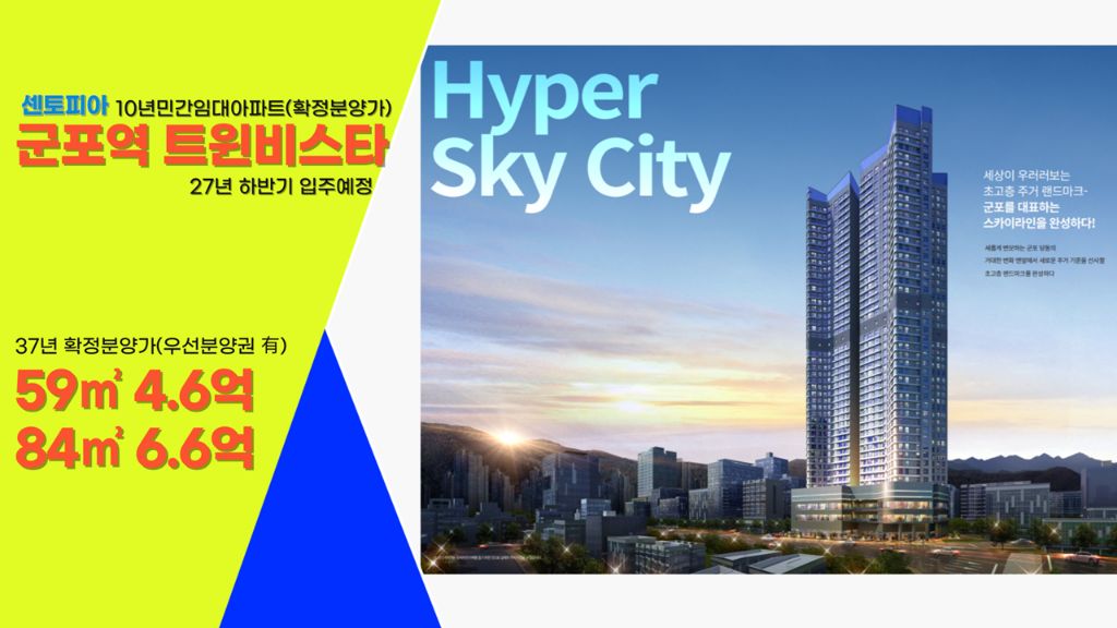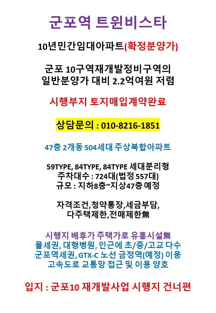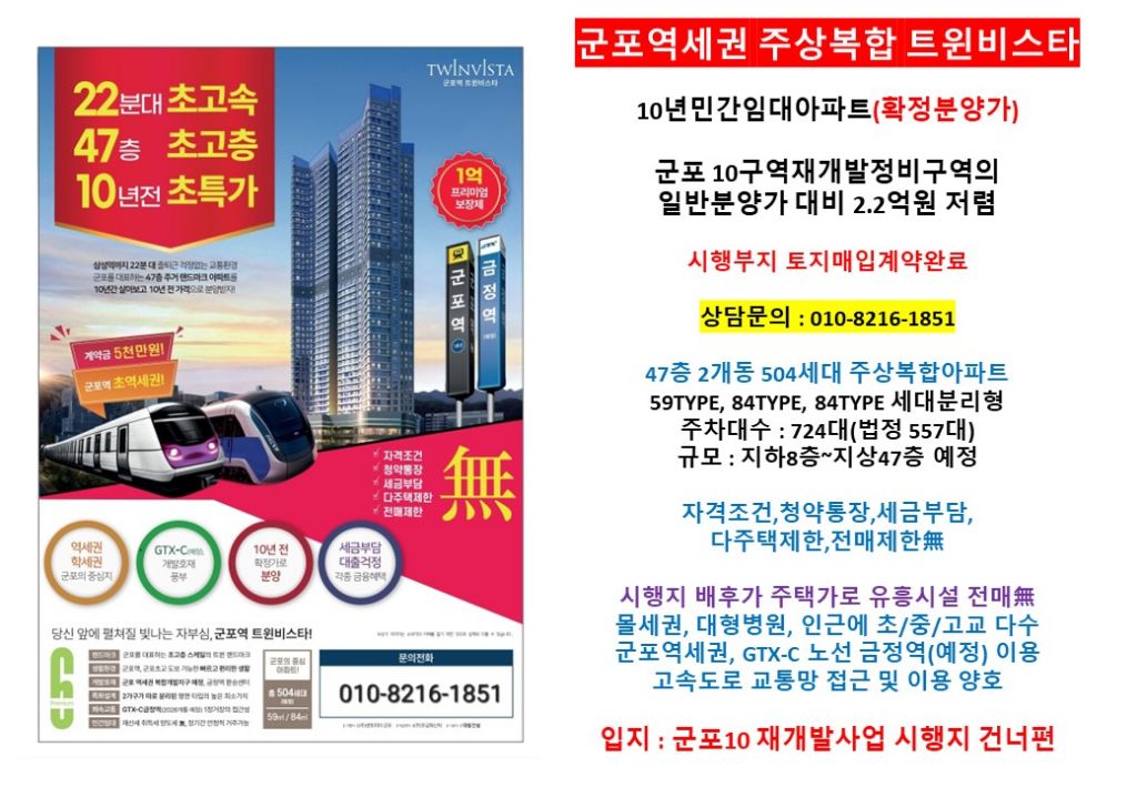 #군포역트윈비스타 #민간임대주택아파트 #군포역세권입지 #47층주상복합504세대 #59타입 #84타입 #84타입세대분리형 #사업지촉진지구지정추진예정 #현계약금액확정분양
