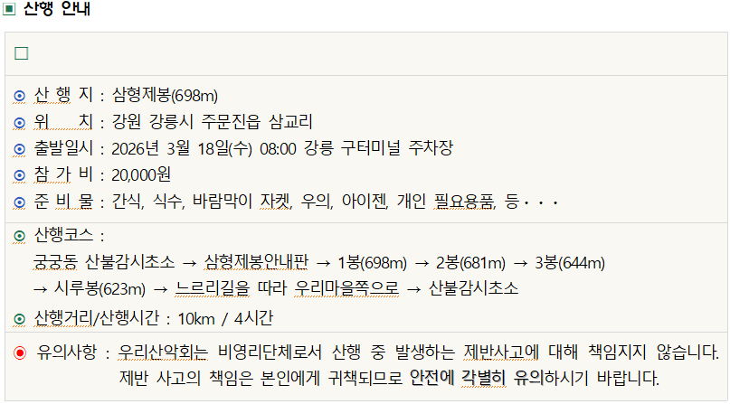 2026년 3월 18일(수) 제26-10차 정기산행(삼형제봉) 탐방계획 작성자김명희|작성시간26.03.13|조회수217 목록 댓글 14 글자크기 작게가 글자크기 크게가 조진환임화식김명희최금숙함영일안영자천지명산남윤선정반시 다음검색 현재 게시글 추가 기능 열기 북마크 공유하기 신고 센터로 신고 댓글 댓글 14 댓글쓰기 답글쓰기 댓글 리스트 답댓글 작성자김명희 작성자 본인 여부 작성자 | 작성시간 26.03.17 등록합니다. 작성자남윤선 | 작성시간 26.03.18 신청합니다 답댓글 작성자김명희 작성자 본인 여부 작성자 | 작성시간 26.03.18 등록합니다. 작성자금숙 | 작성시간 26.03.18 반시님도 동행 합니다 답댓글 작성자김명희 작성자 본인 여부 작성자 | 작성시간 26.03.18 등록합니다. 댓글 전체보기