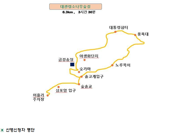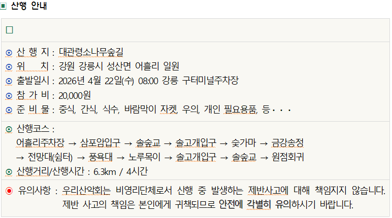 2026년 4월 22일 제25-15차 정기산행(대관령 소나무숲길) 탐방계획 작성자김명희|작성시간26.04.18|조회수86 목록 댓글 4 글자크기 작게가 글자크기 크게가 조진환임화식김명희남윤선천지명산 다음검색 현재 게시글 추가 기능 열기 북마크 공유하기 신고 센터로 신고 댓글 댓글 4 댓글쓰기 답글쓰기 댓글 리스트 작성자남윤선 | 작성시간 26.04.20 신청합니다 답댓글 작성자김명희 작성자 본인 여부 작성자 | 작성시간 26.04.21 등록합니다. 작성자천지명산 | 작성시간 26.04.21 참석합니다~~ 답댓글 작성자김명희 작성자 본인 여부 작성자 | 작성시간 26.04.21 등록합니다. 댓글 전체보기