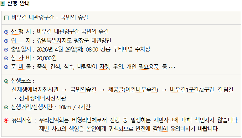 2026년 4월 29일 제25-16차 정기산행(대관령 국민의 숲길) 탐방계획 작성자김명희|작성시간26.04.24|조회수112 목록 댓글 6 글자크기 작게가 글자크기 크게가 조진현임화식김명희남윤선최돈의천지명산 다음검색 현재 게시글 추가 기능 열기 북마크 공유하기 신고 센터로 신고 댓글 댓글 6 댓글쓰기 답글쓰기 댓글 리스트 답댓글 작성자김명희 작성자 본인 여부 작성자 | 작성시간 26.04.27 등록합니다. 작성자진환 | 작성시간 26.04.28 new 최돈의 신청합니다 답댓글 작성자김명희 작성자 본인 여부 작성자 | 작성시간 26.04.28 new 등록합니다. 작성자천지명산 | 작성시간 26.04.28 new 저도 동행 합니다. 답댓글 작성자김명희 작성자 본인 여부 작성자 | 작성시간 26.04.28 new 등록합니다. 댓글 전체보기