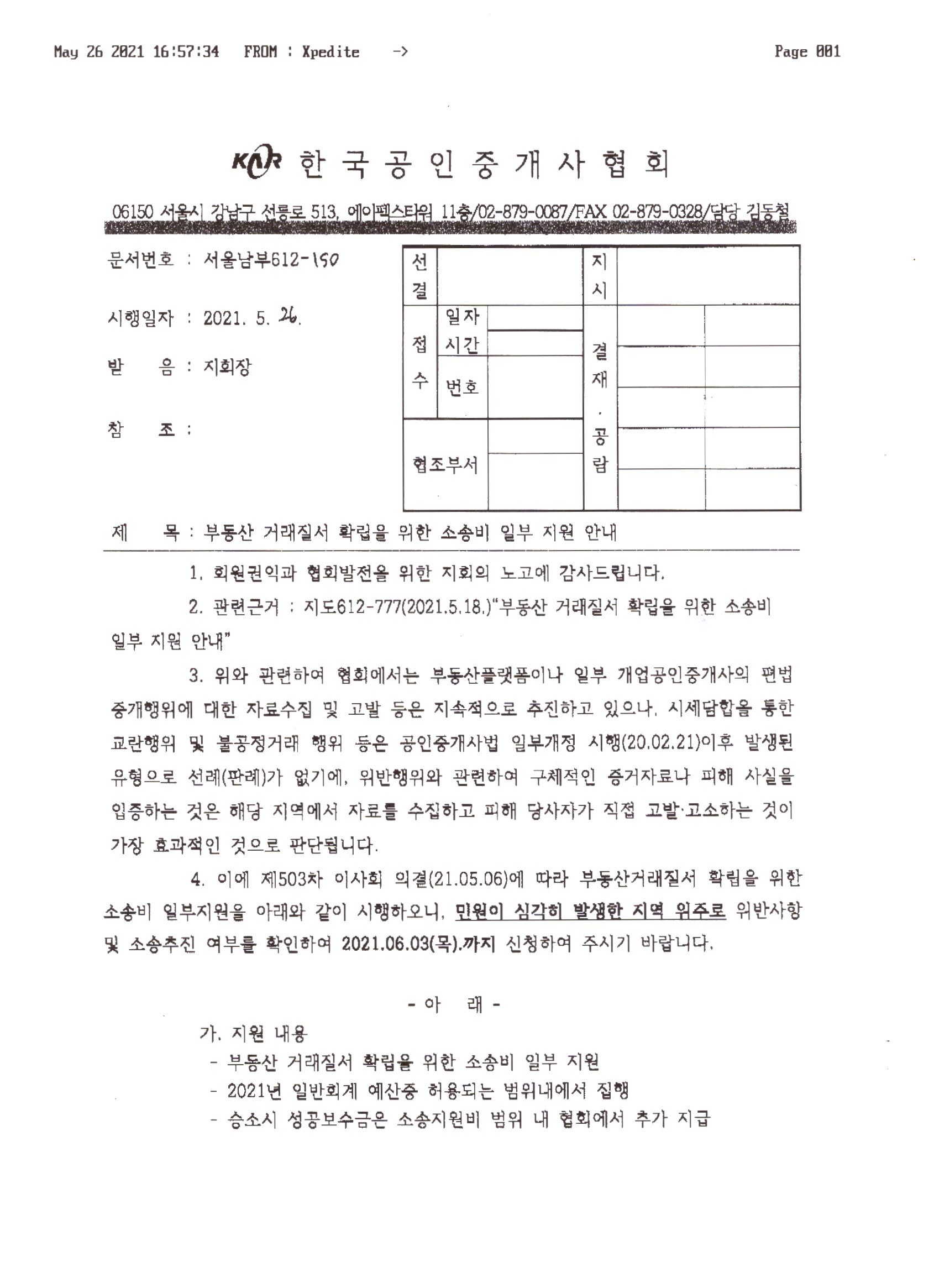 부동산 거래질서 확립을 위한 소송비 일부지원 안내 작성자지회장 김용혁-에어뷰|작성시간21.05.27|조회수54 목록 댓글 0 글자크기 작게가 글자크기 크게가 다음검색 현재 게시글 추가 기능 열기 북마크 공유하기 신고 센터로 신고 댓글 댓글 0 댓글쓰기 답글쓰기 댓글 리스트