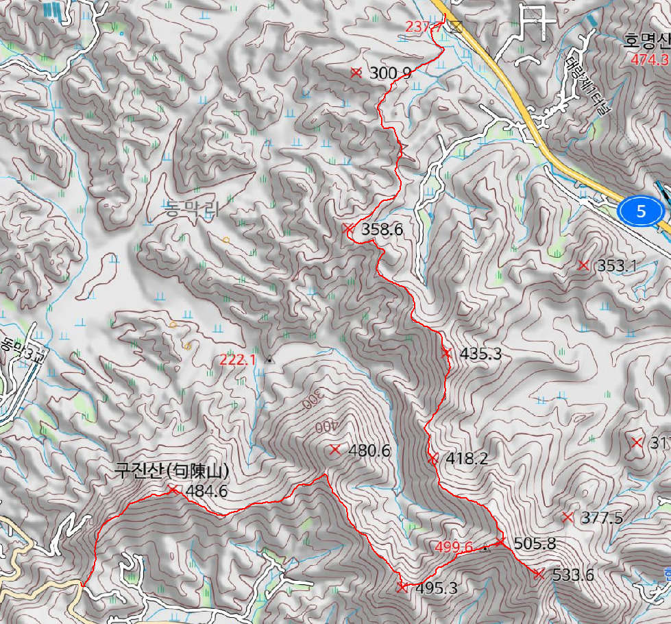 호명산에서 중앙선 철도를 건너 남서쪽으로 약 3.8km 지점에 단양의 접경에 대장산(大壯山)이 변천한 구진산(483m)은 금성면 양화리로 통하는 안현(鞍峴, 350m)을 향하여 표고가 높아서 동쪽으로 단양을 향하여 냇물이 흐르는 반면에 구진산의 북사면은 서쪽에 고교천에 흘러들어 가는 전략적인 지세이다.