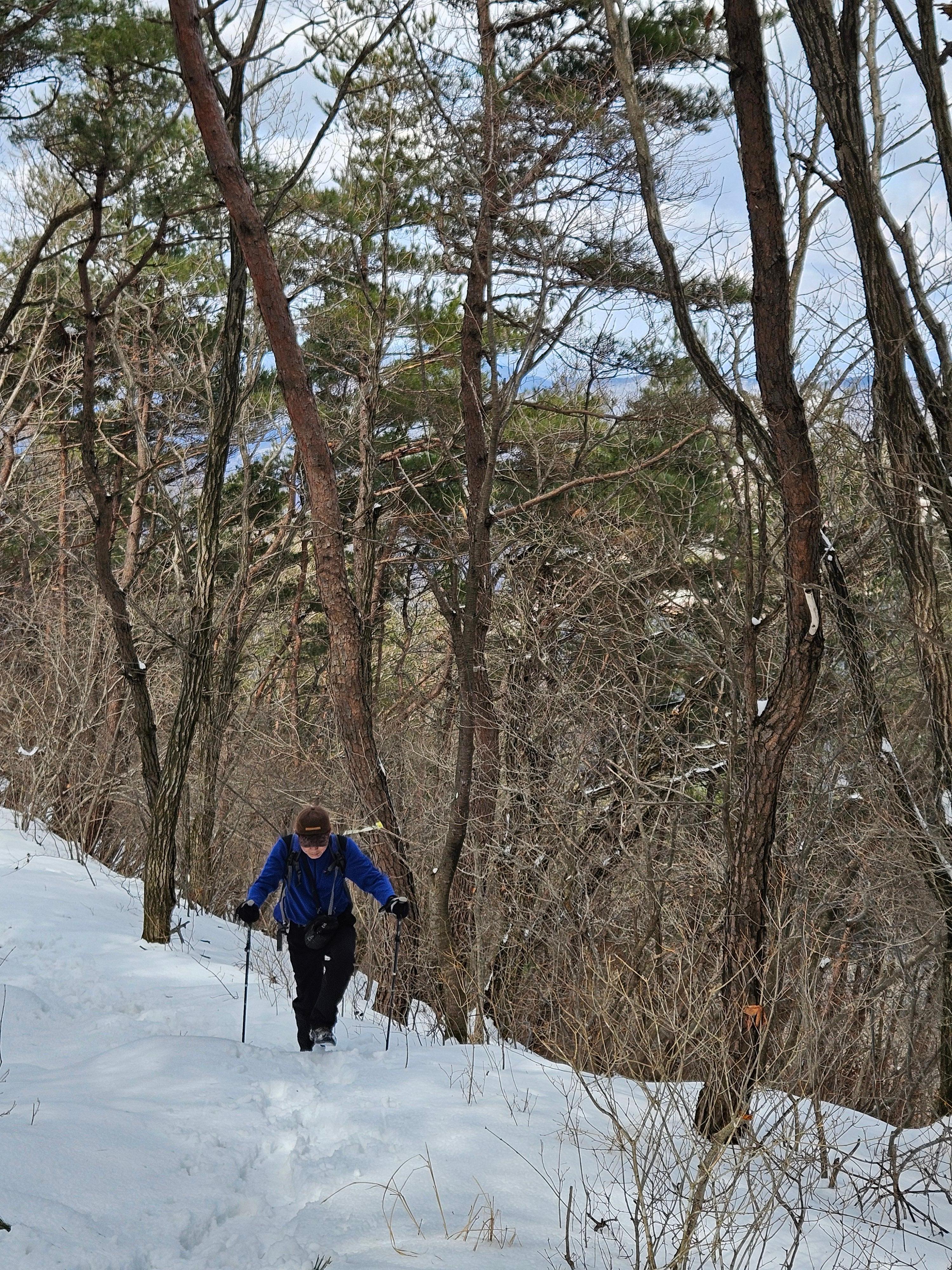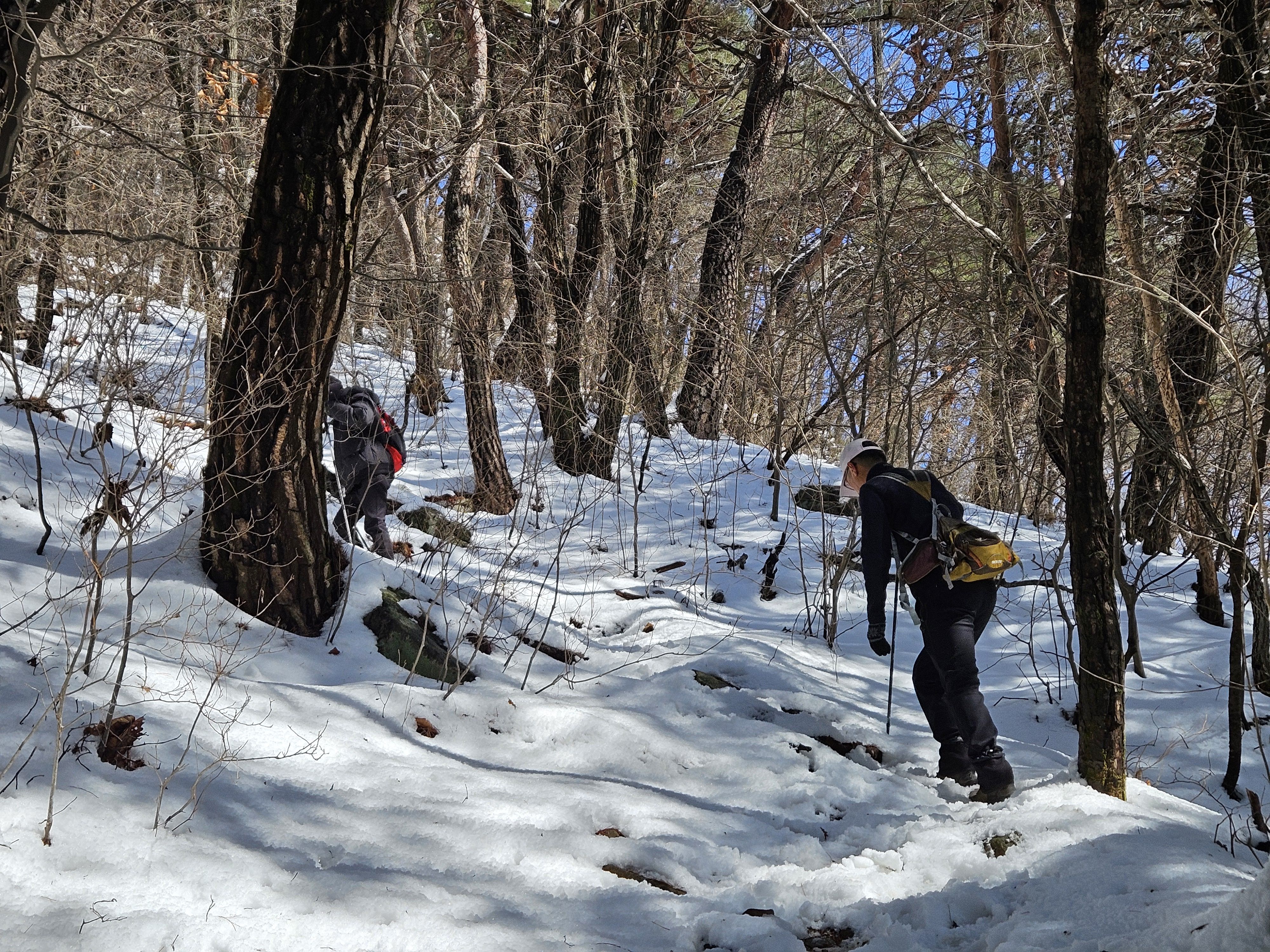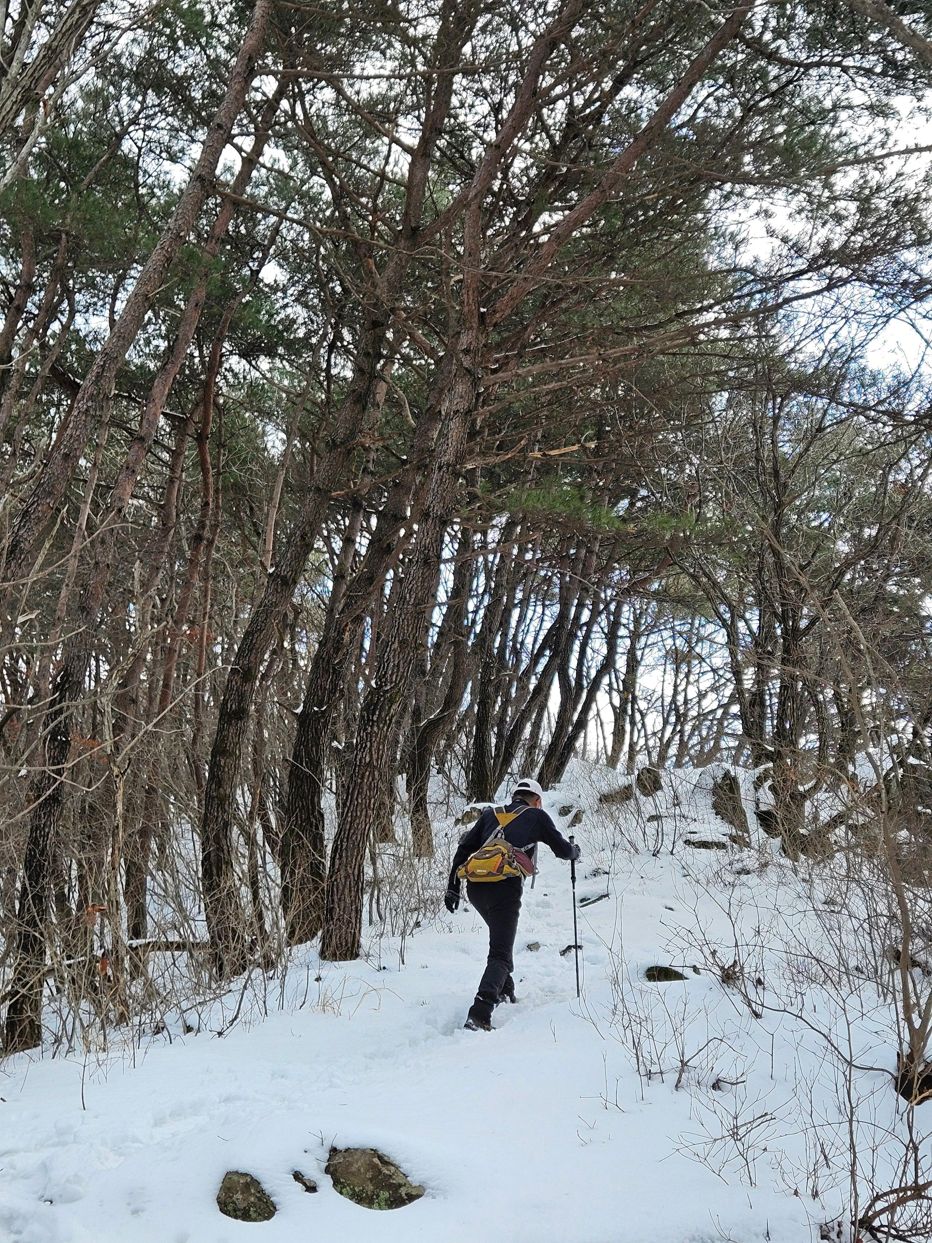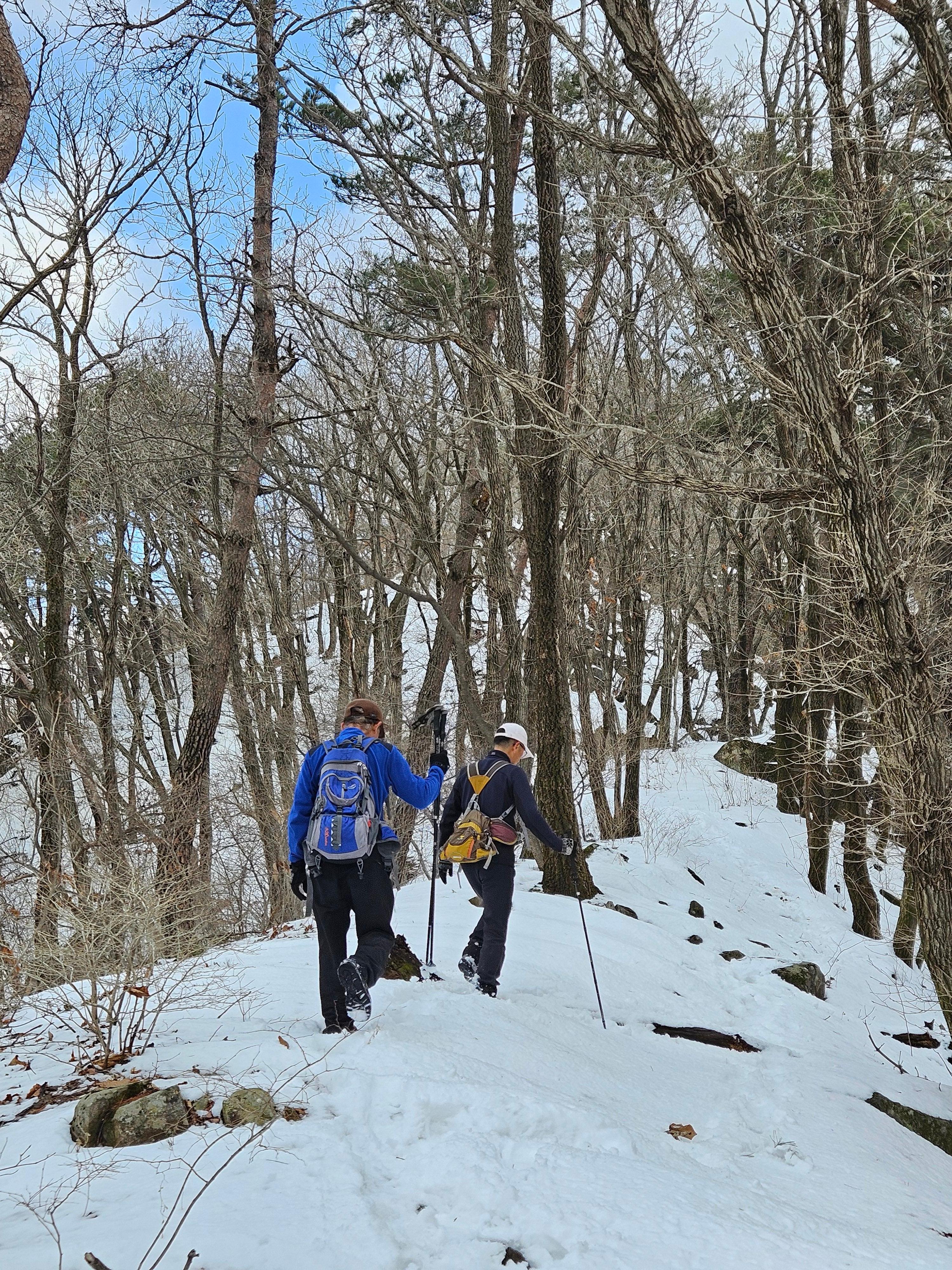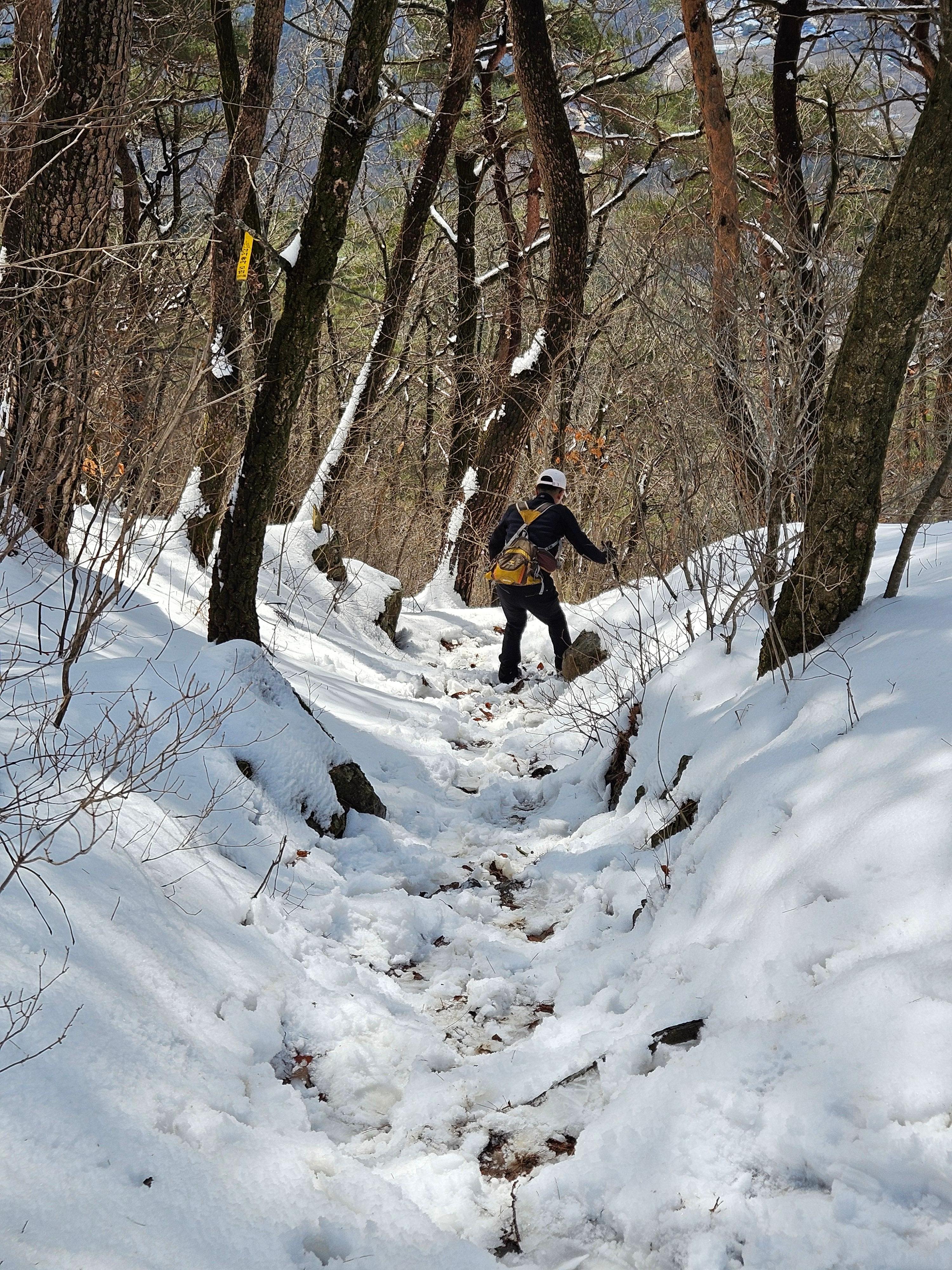 눈이 많고 가파른 오르막 과 너덜길 미끄러워 조심조심...