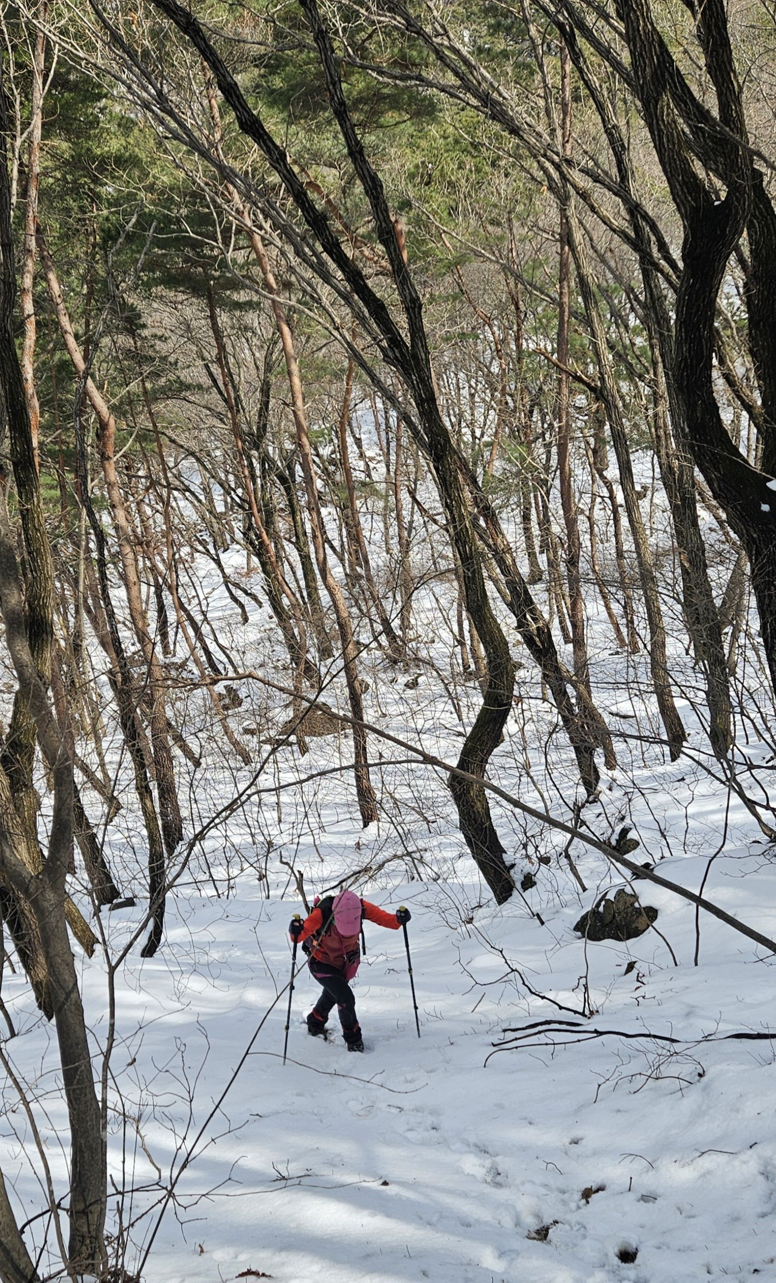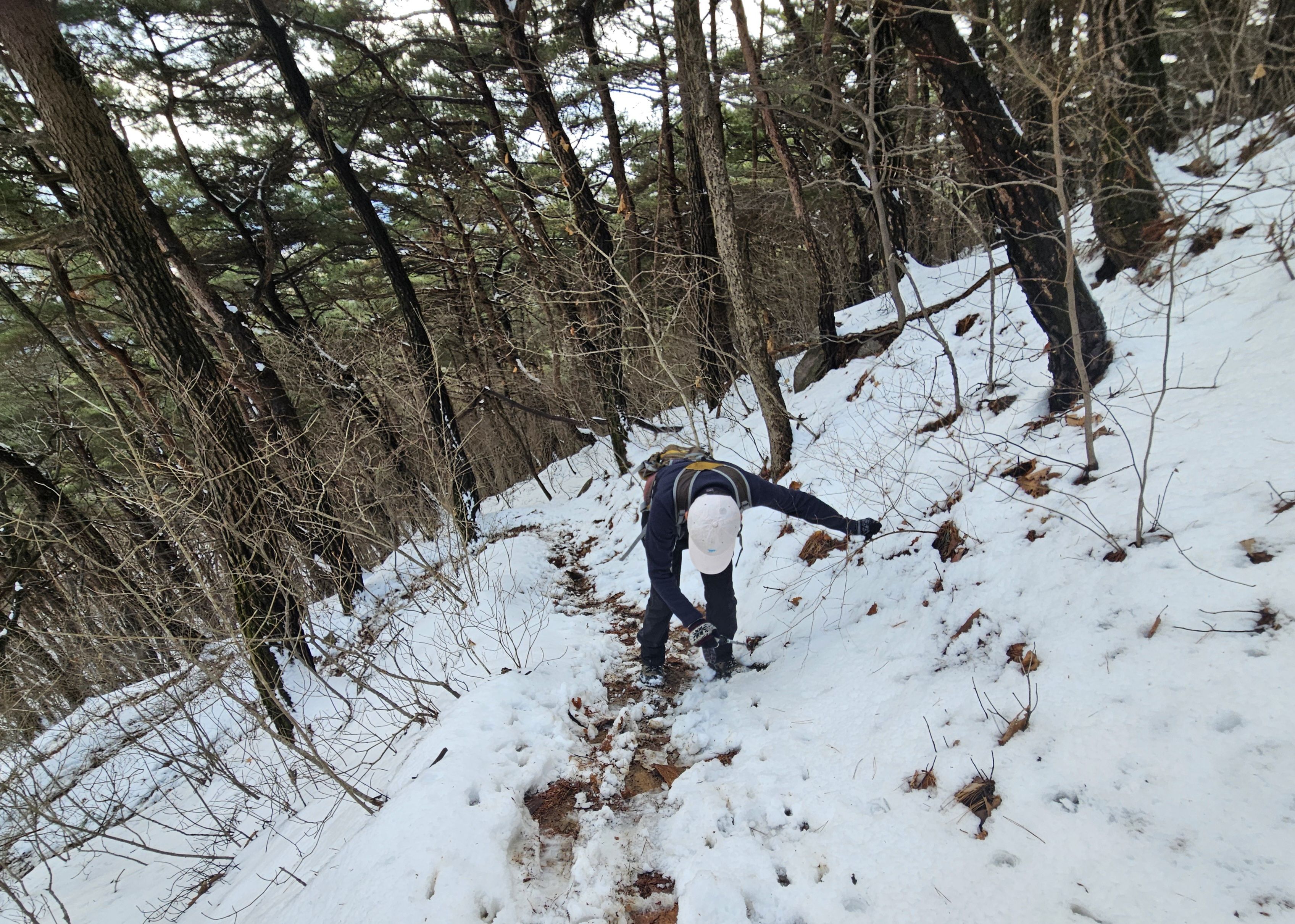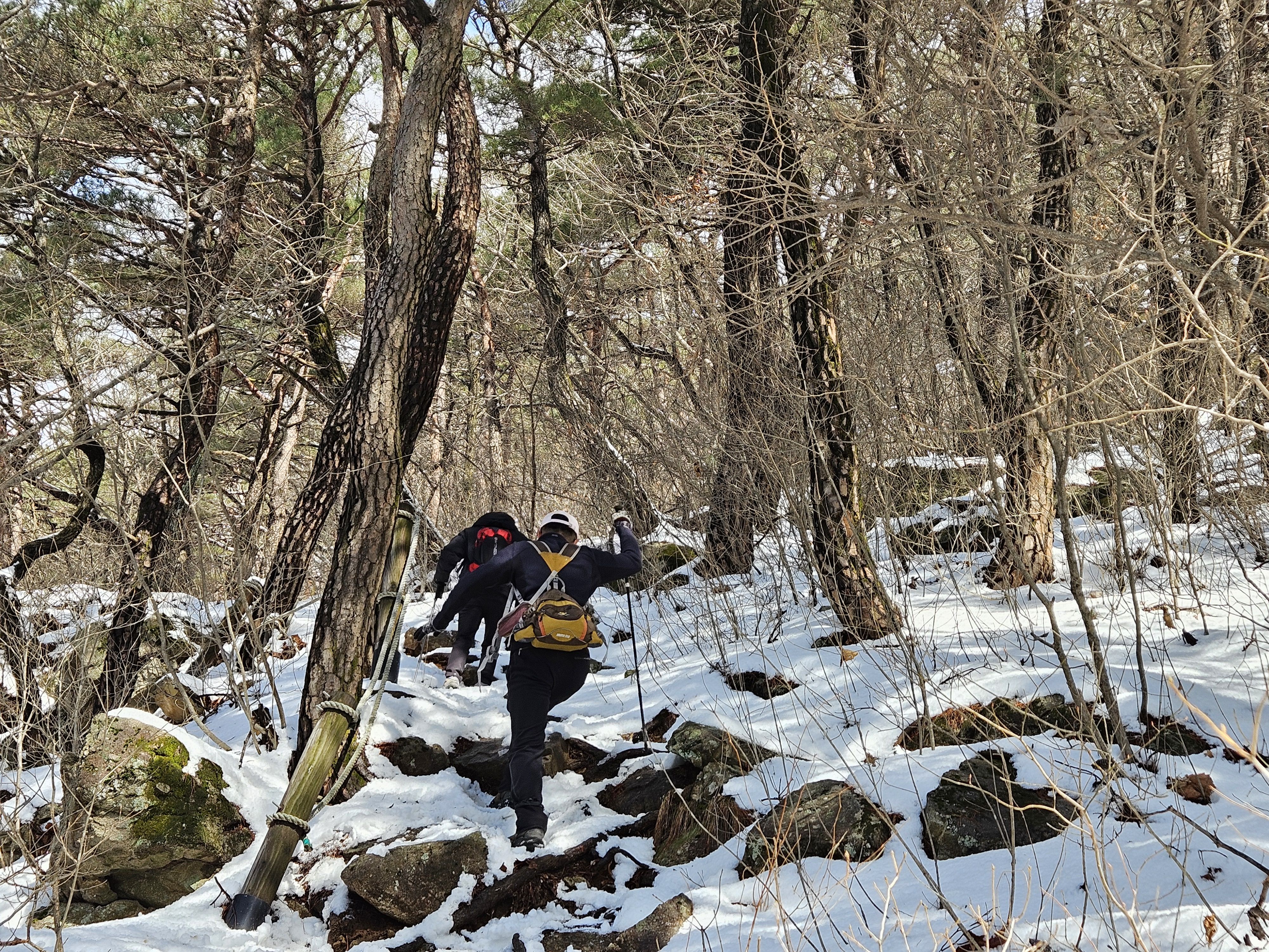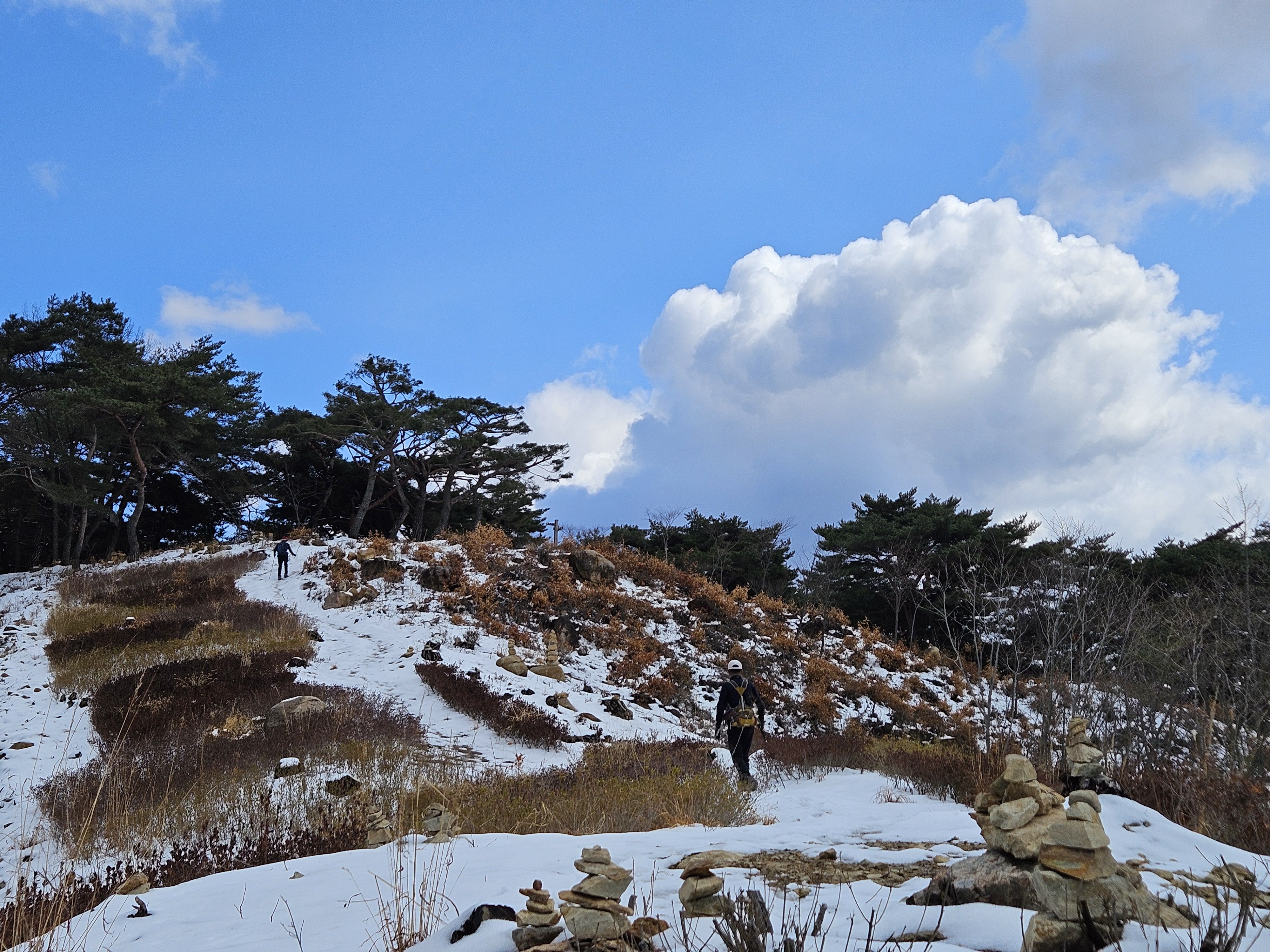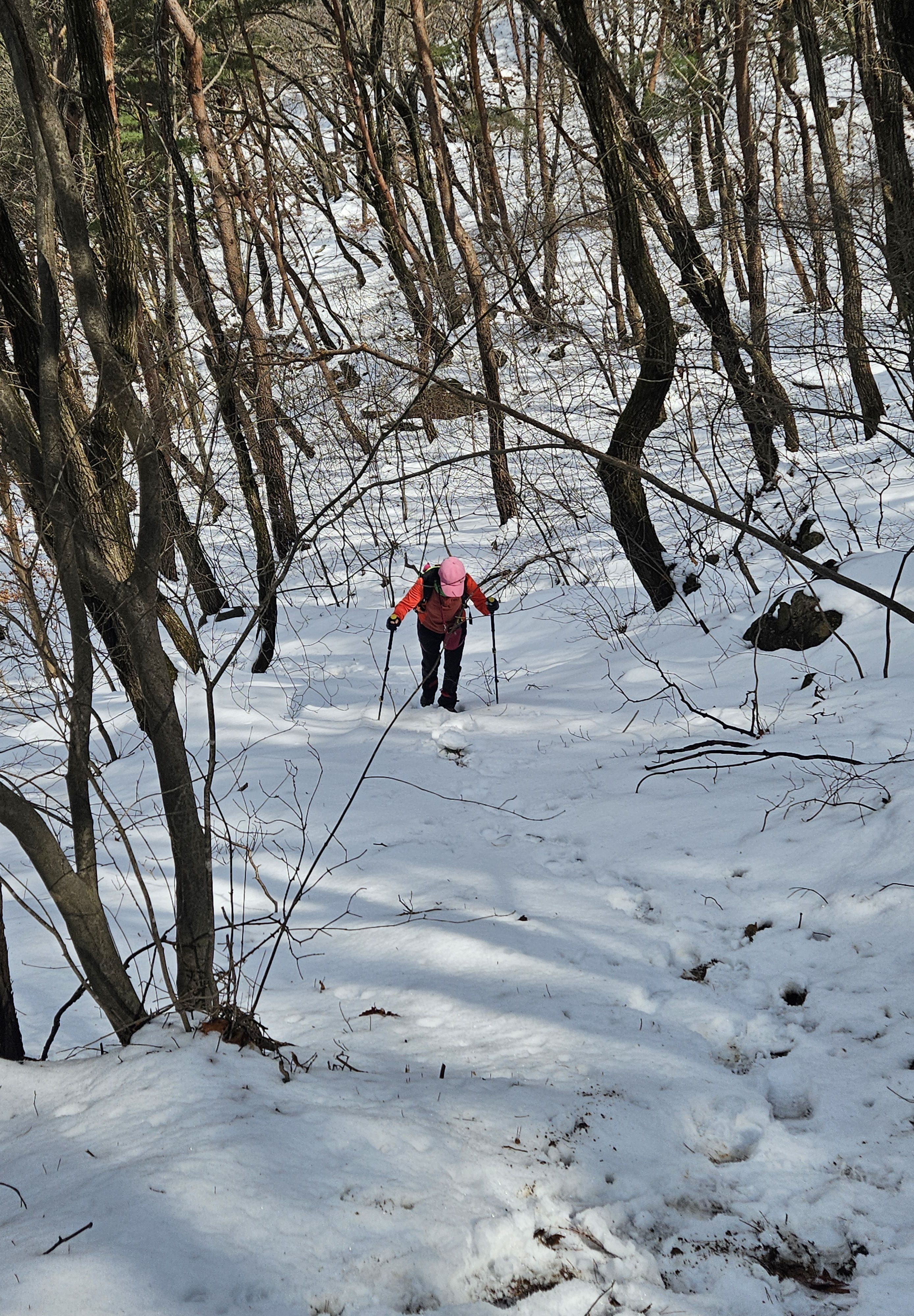 눈이 많고 가파른 오르막 과 너덜길 미끄러워 조심조심...