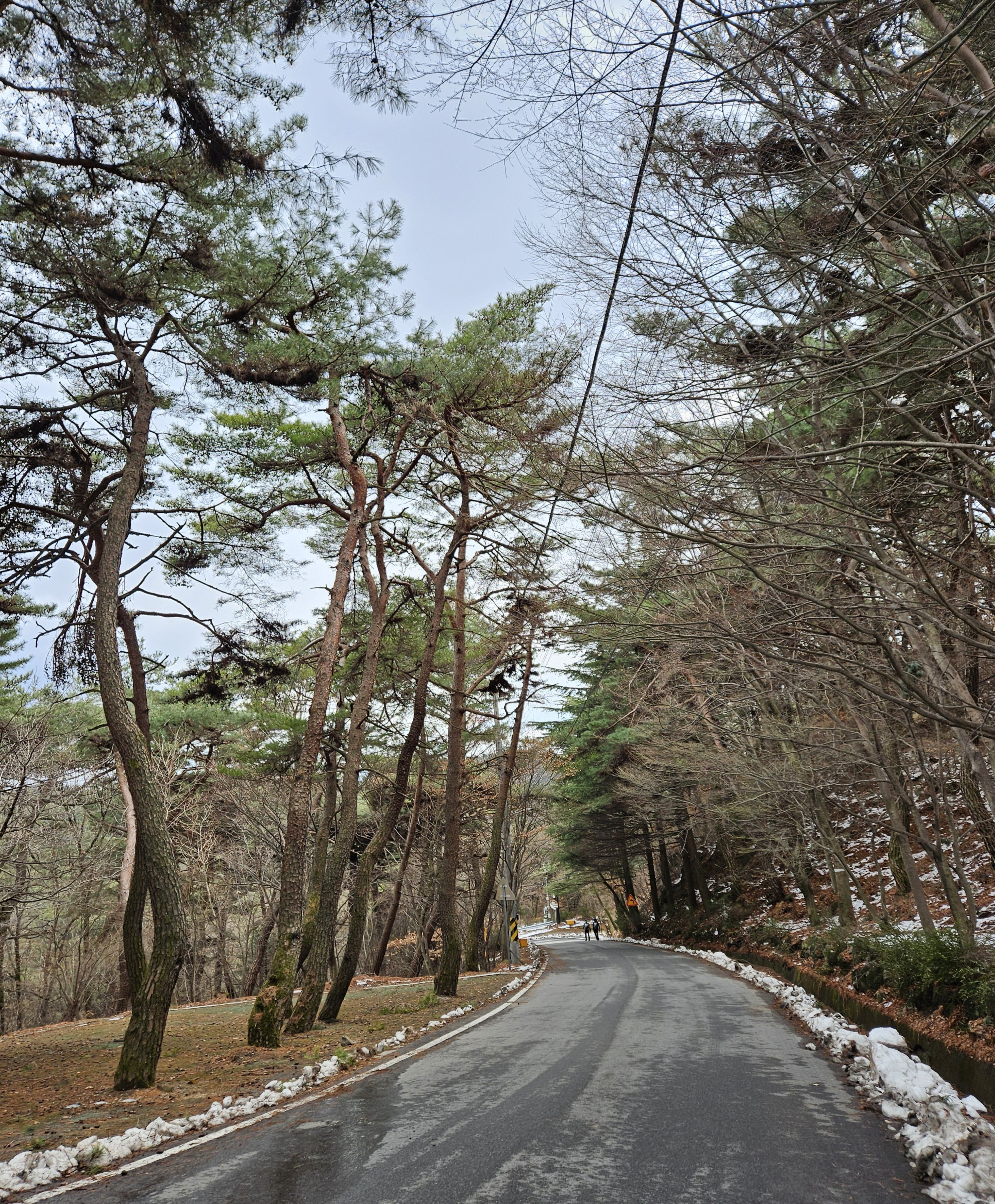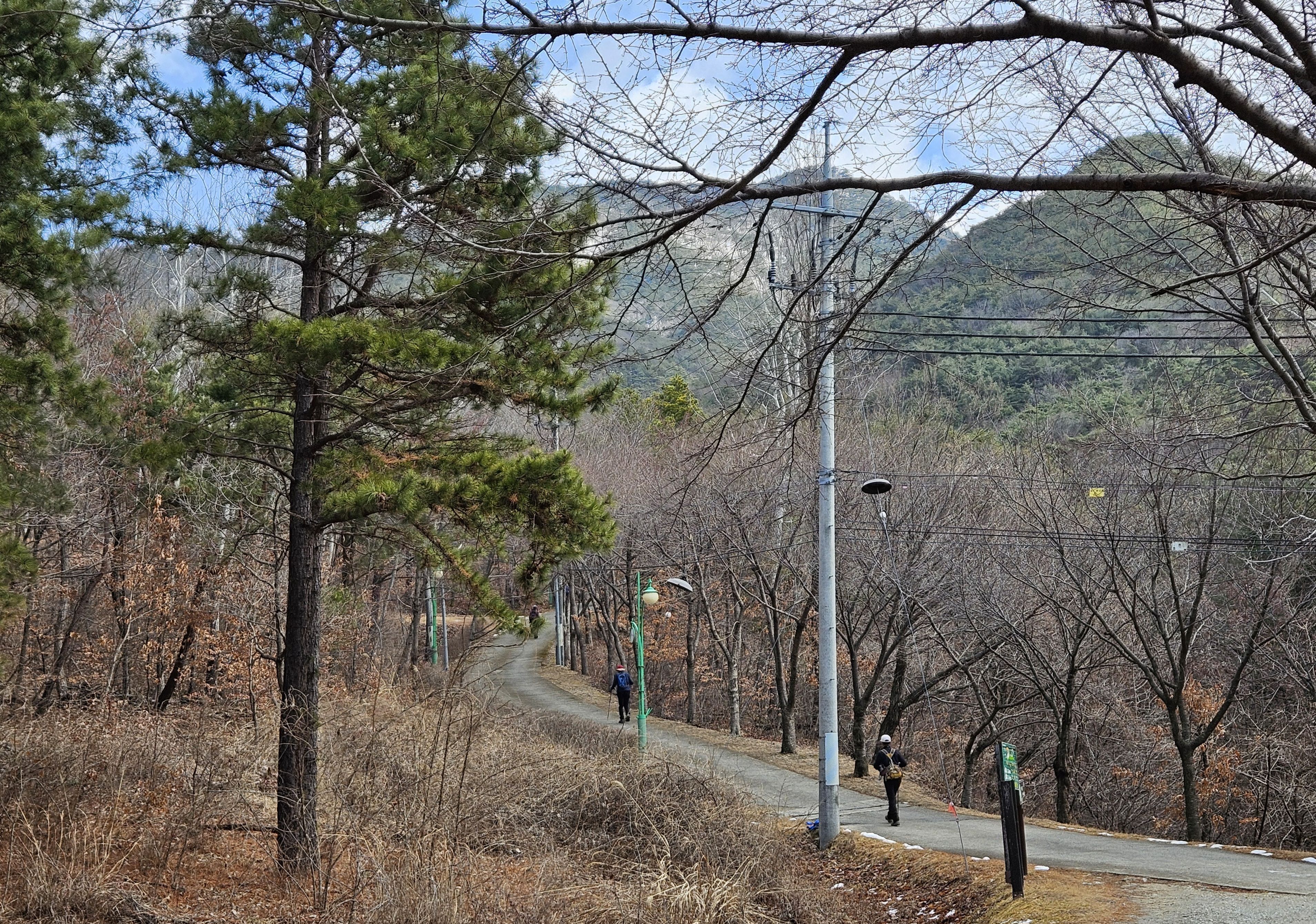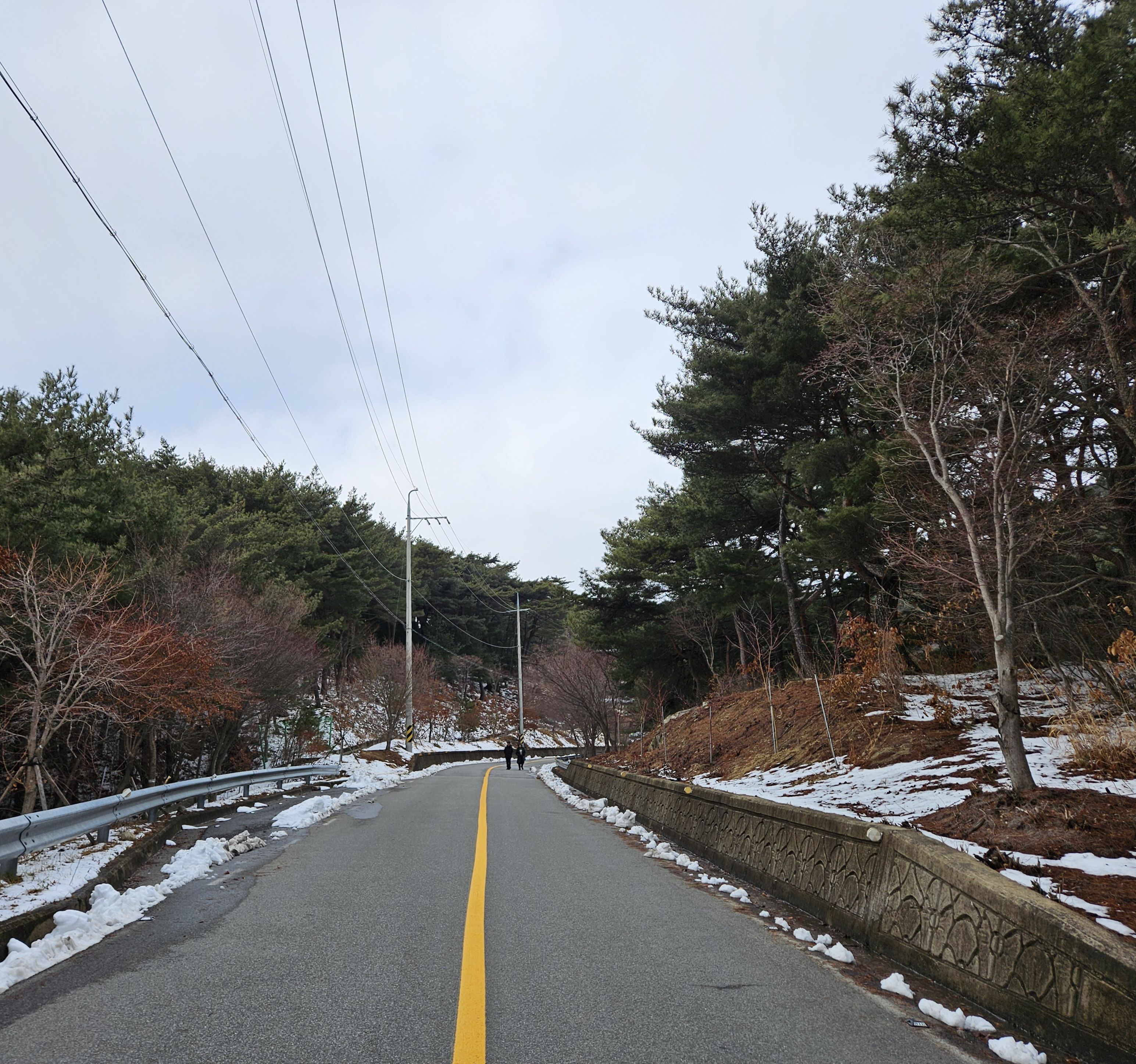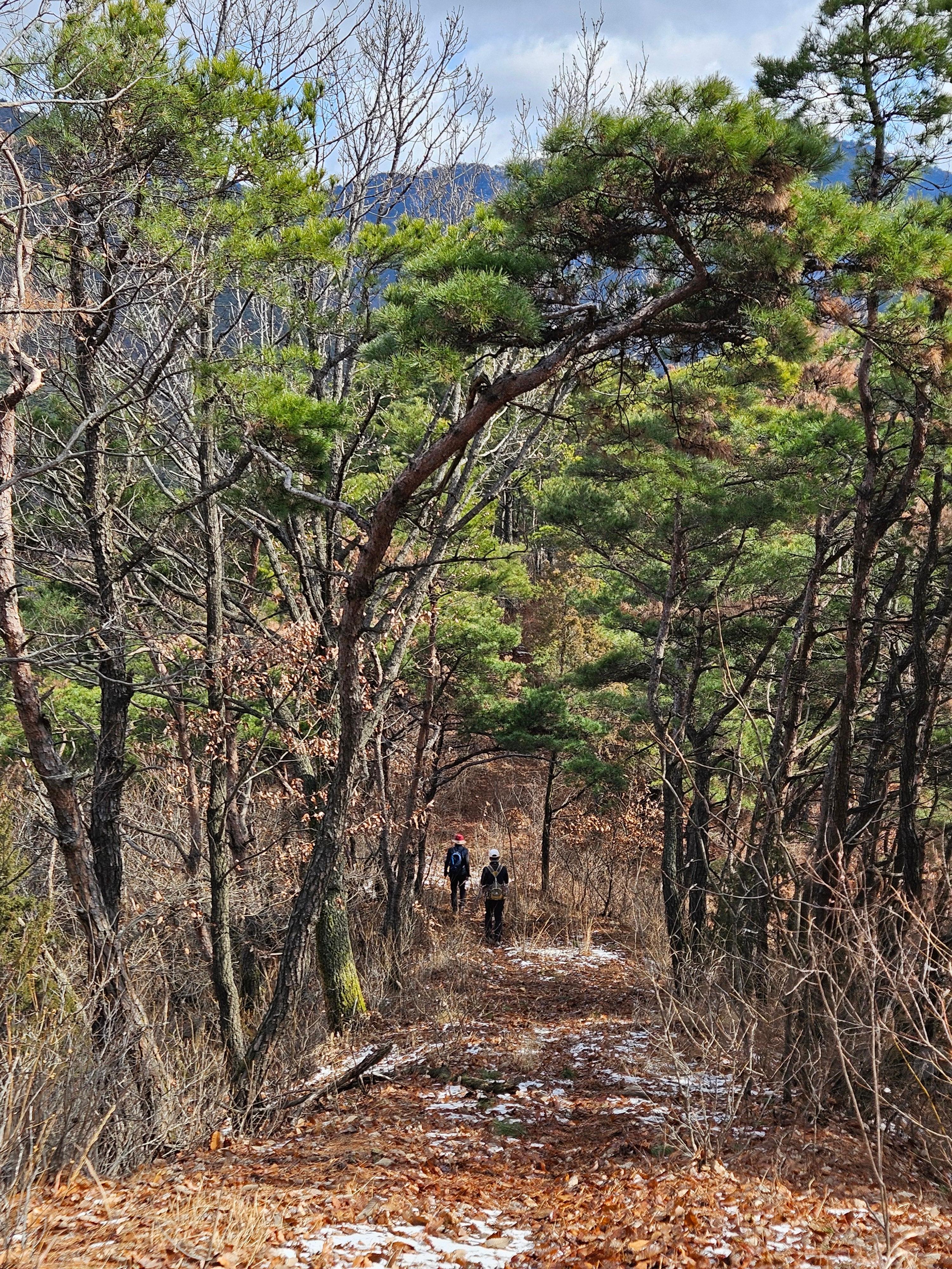 아직은 눈이 없는 푸른 소나무숲길 이 멋졌습니다.