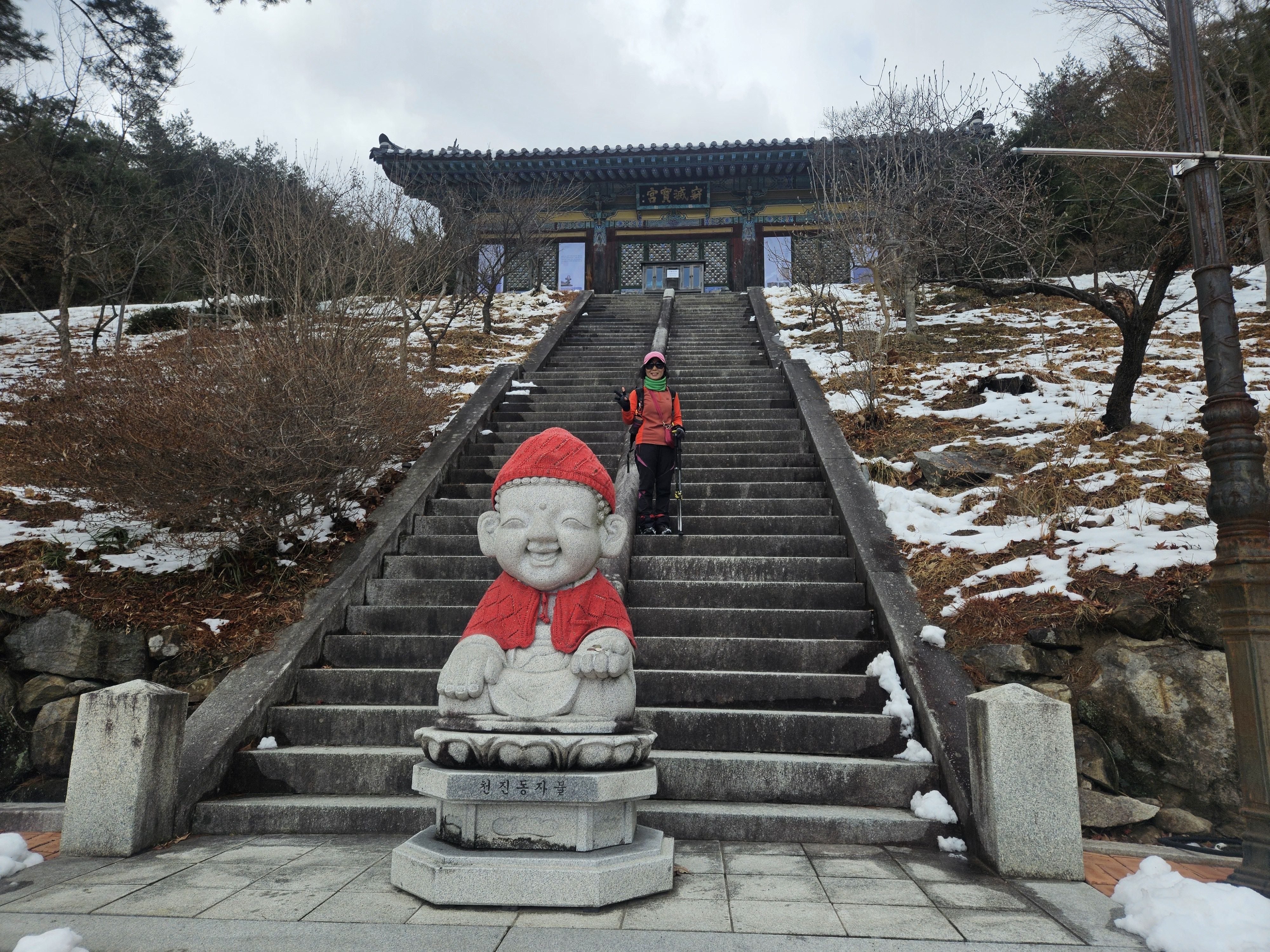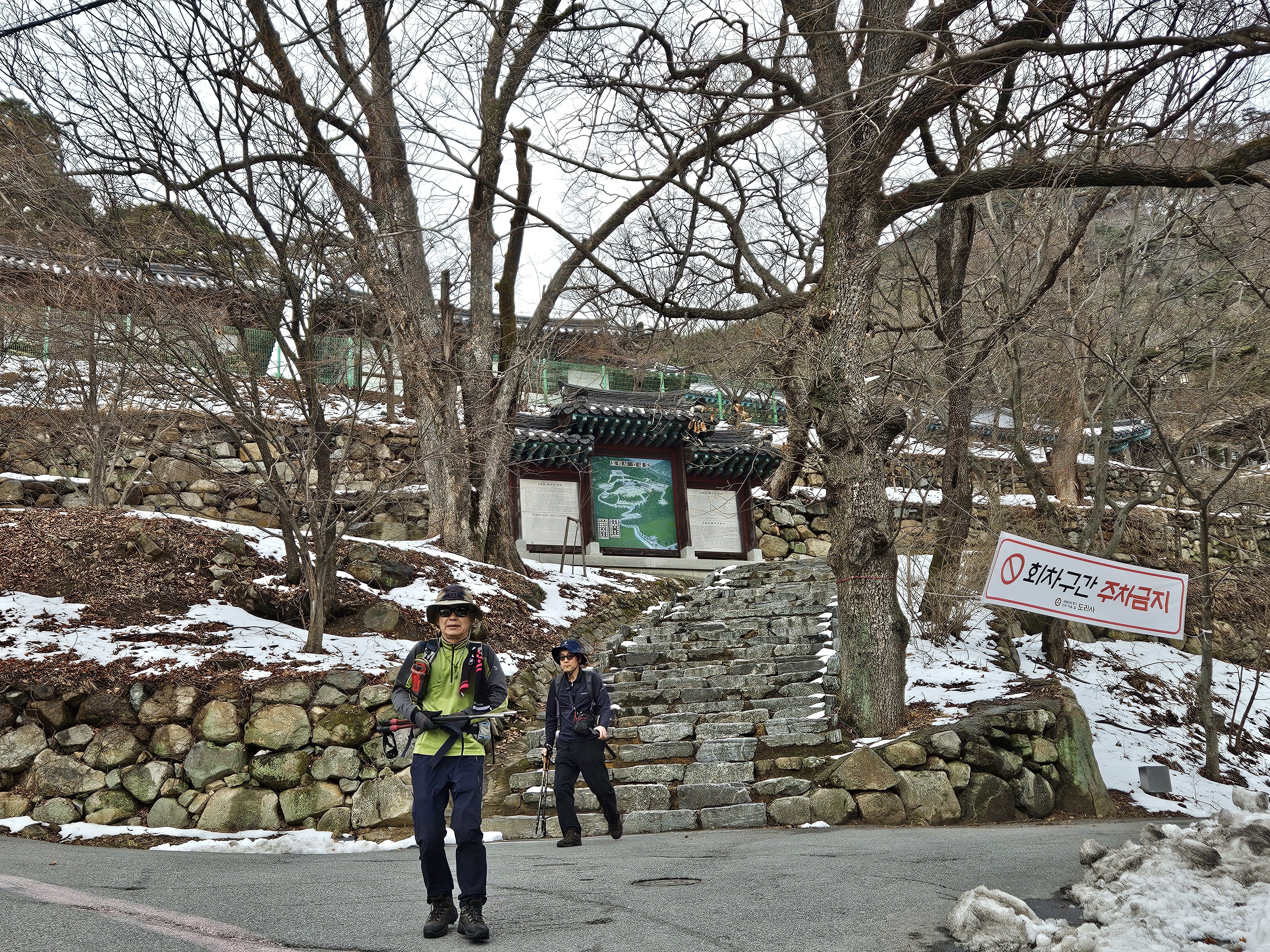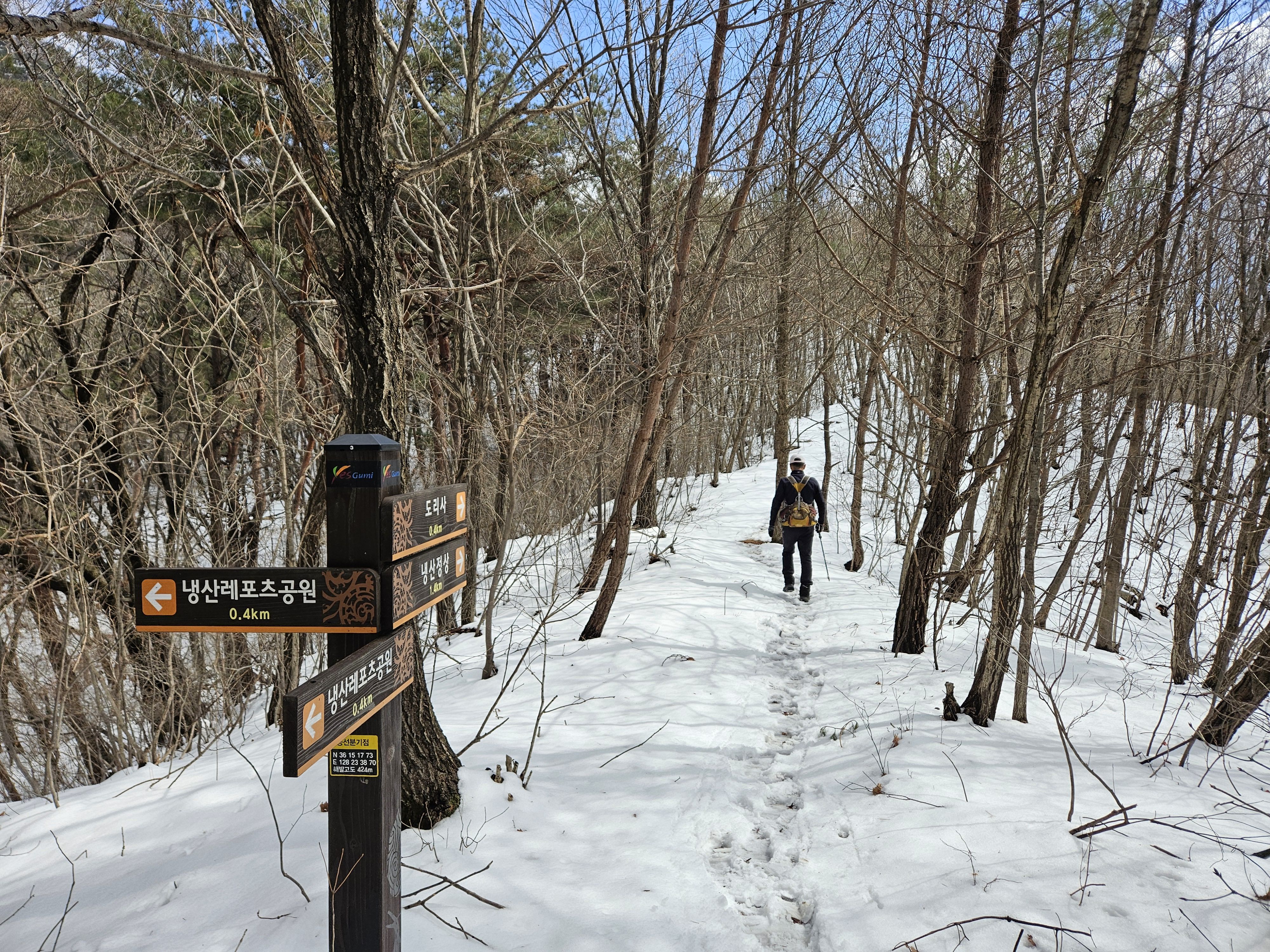 기온이 많이 올라 포근했던 날씨로 등반시는 등에 땀 흠뻑 나더라구요..첨 출발시는 눈이 보이지 않아 별 걱정없이 편하게 걸었는데 어머나 *구미 산악레포츠 공원* 이후 부텀 차츰 눈이 많아지면서 등로가 미끄러운 최대로 천천히 올라갔는데... 막바지엔 아이젠 착용까지 하게 되었습니다. 냉산 이후는 직진 등선이 정코스 하산이였지만 일부는 냉산에서 빽~~~빠른길로 (도리사) 로 하산..빨라진 시간 만큼 도리사 에서 여유롭게 돌아 볼 수 있어 좋았습니다. 천천히 주차장으로...
