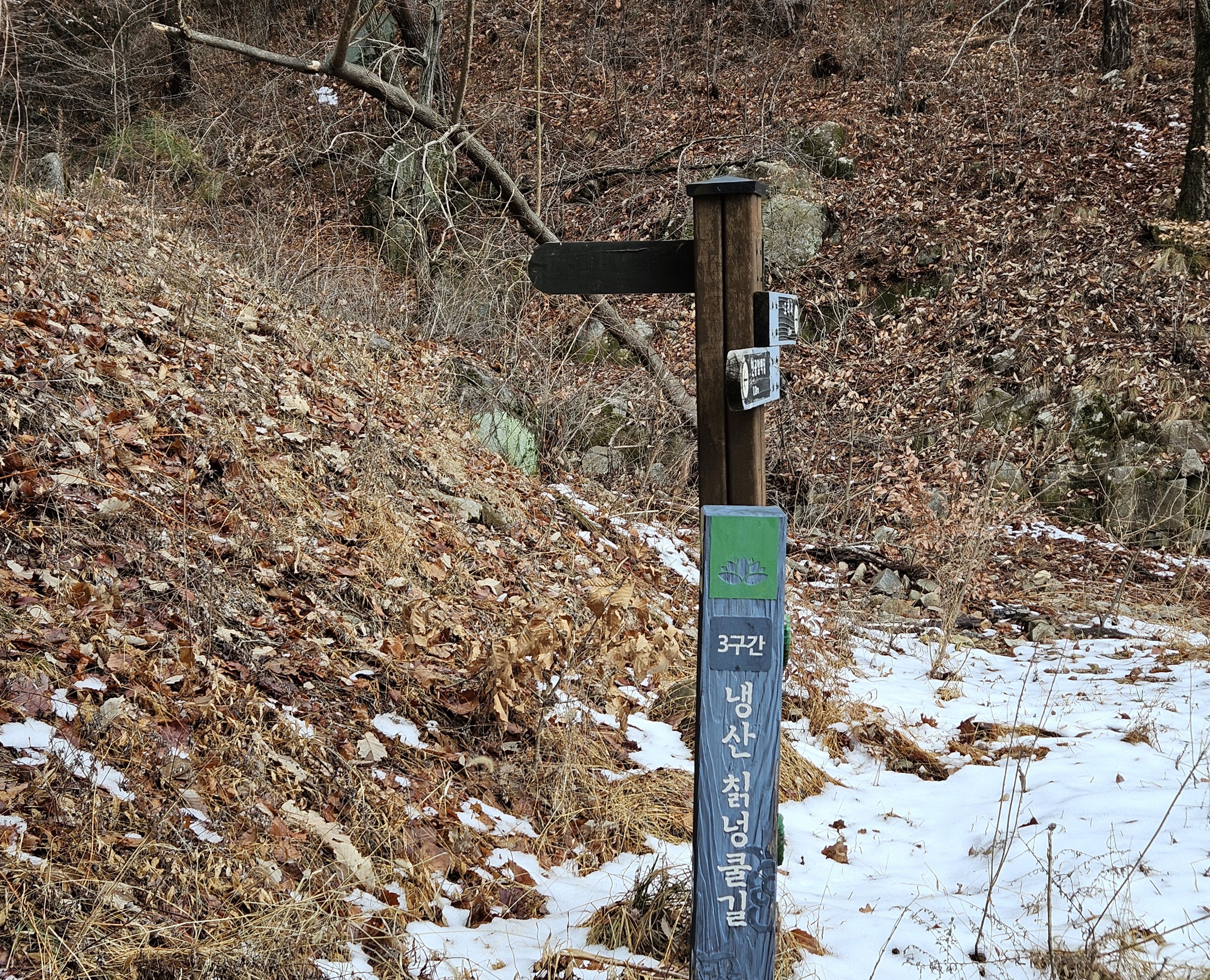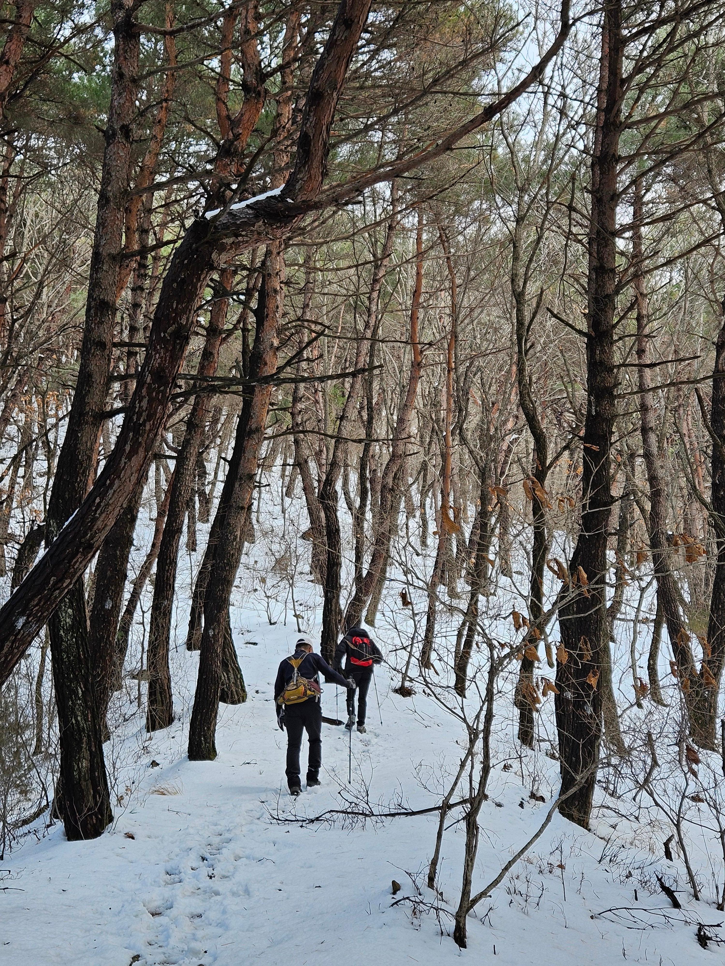 하산은 조금전 냉산 급경사 오르막길로 내려 갔는데 엄청 미끄럽고 위험 했습니다.(아이젠 착용 했지만 한 번 꽈당..)