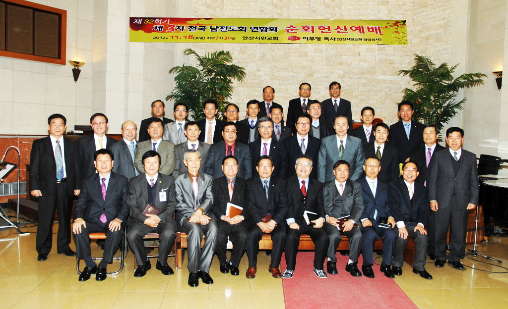 32회기 전국남전도회연합회3차 헌신예배가2012녀11월18일(추수감사절)오후7시30분 안산시민교회(이무영목사)에서 강신홍 장로(회장)의 사회로 이무영목사의(하나님의 의견에 동의하라)말씀으로 예배를드리다