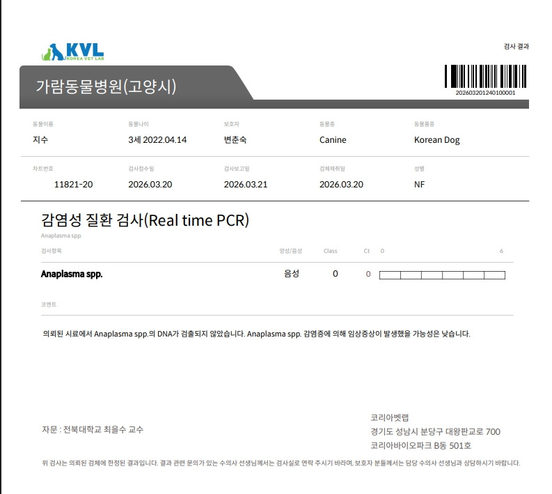 아나플라즈마(Anaplasma) PCR검사결과:음성(Negative)-진도믹스견 지수 작성자가람캡틴|작성시간26.03.23|조회수4 목록 댓글 0 글자크기 작게가 글자크기 크게가 3월23일지수아나플라즈마.pdf141.57KB 첨부파일첨부된 파일이 2개 있습니다. jpg 파일 3월23일지수아나플라즈마.jpg 다운로드 pdf 파일 3월23일지수아나플라즈마.pdf 다운로드 다음검색 현재 게시글 추가 기능 열기 북마크 공유하기 신고 센터로 신고 댓글 댓글 0 댓글쓰기 답글쓰기 댓글 리스트