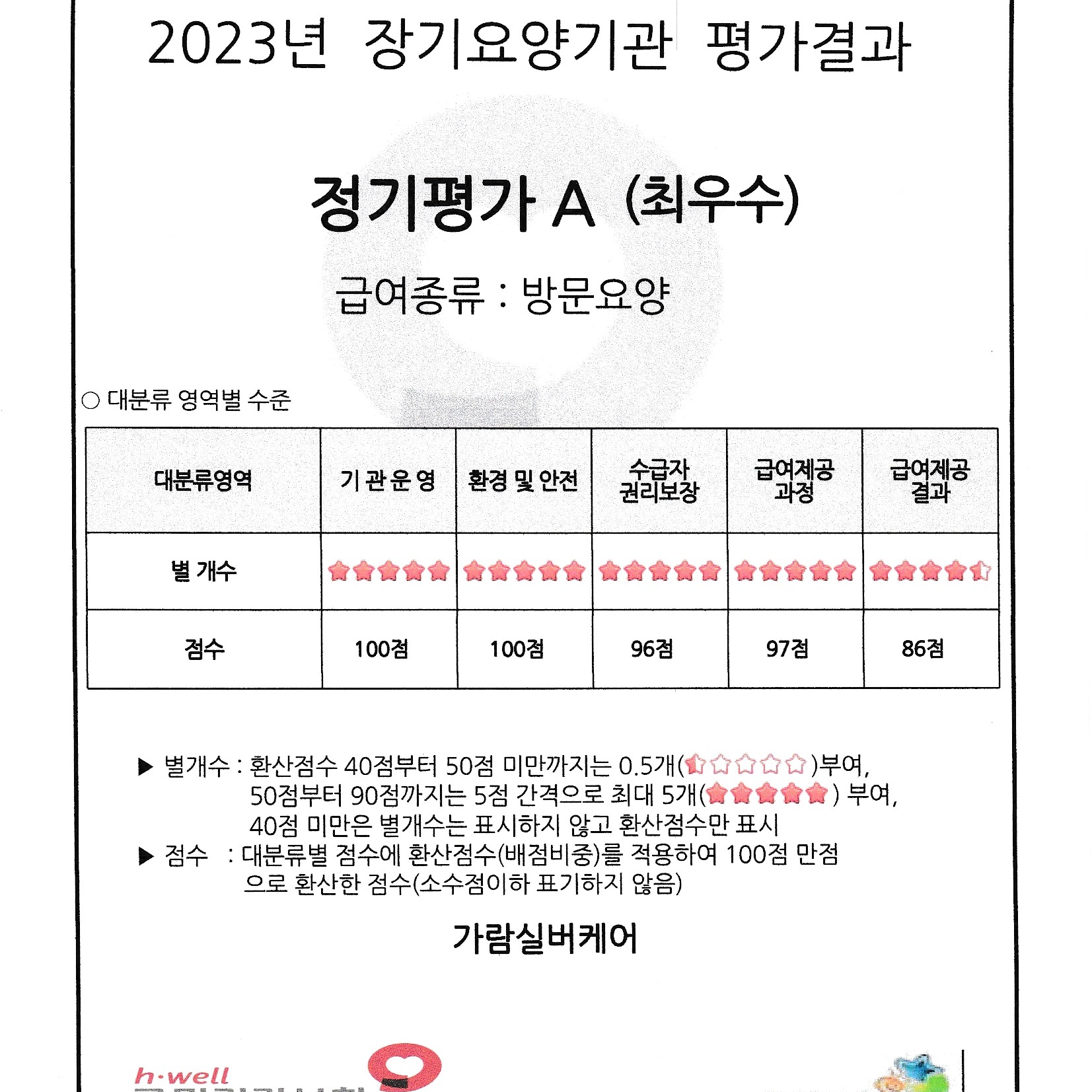 2023년 장기요양기관 평가결과 : 정기평가 A(최우수) 작성자꼬보|작성시간24.05.18|조회수11 목록 댓글 0 글자크기 작게가 글자크기 크게가 다음검색 현재 게시글 추가 기능 열기 북마크 공유하기 신고 센터로 신고 댓글 댓글 0 댓글쓰기 답글쓰기 댓글 리스트